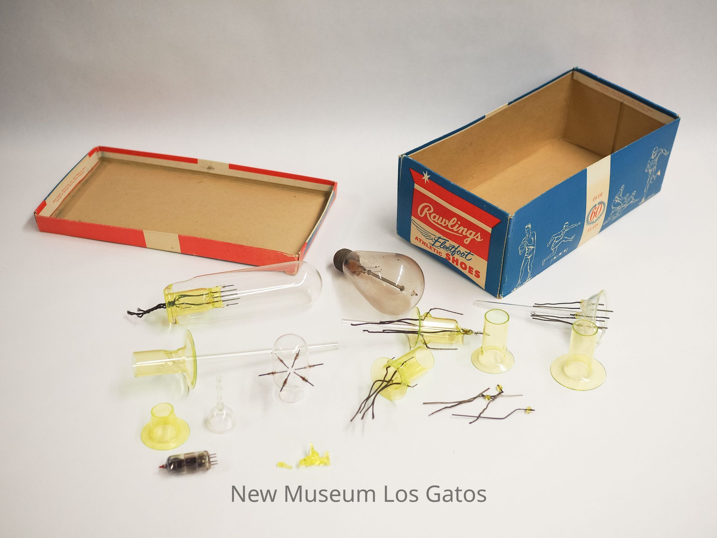 Fragments of some device dated to WWII, stored in a red, white, and blue Rawling's Athletic Shoe Box. The fragments consist of various clear and green-tinted glass tubes, wires, and lightbulbs of indeterminate use.Collection