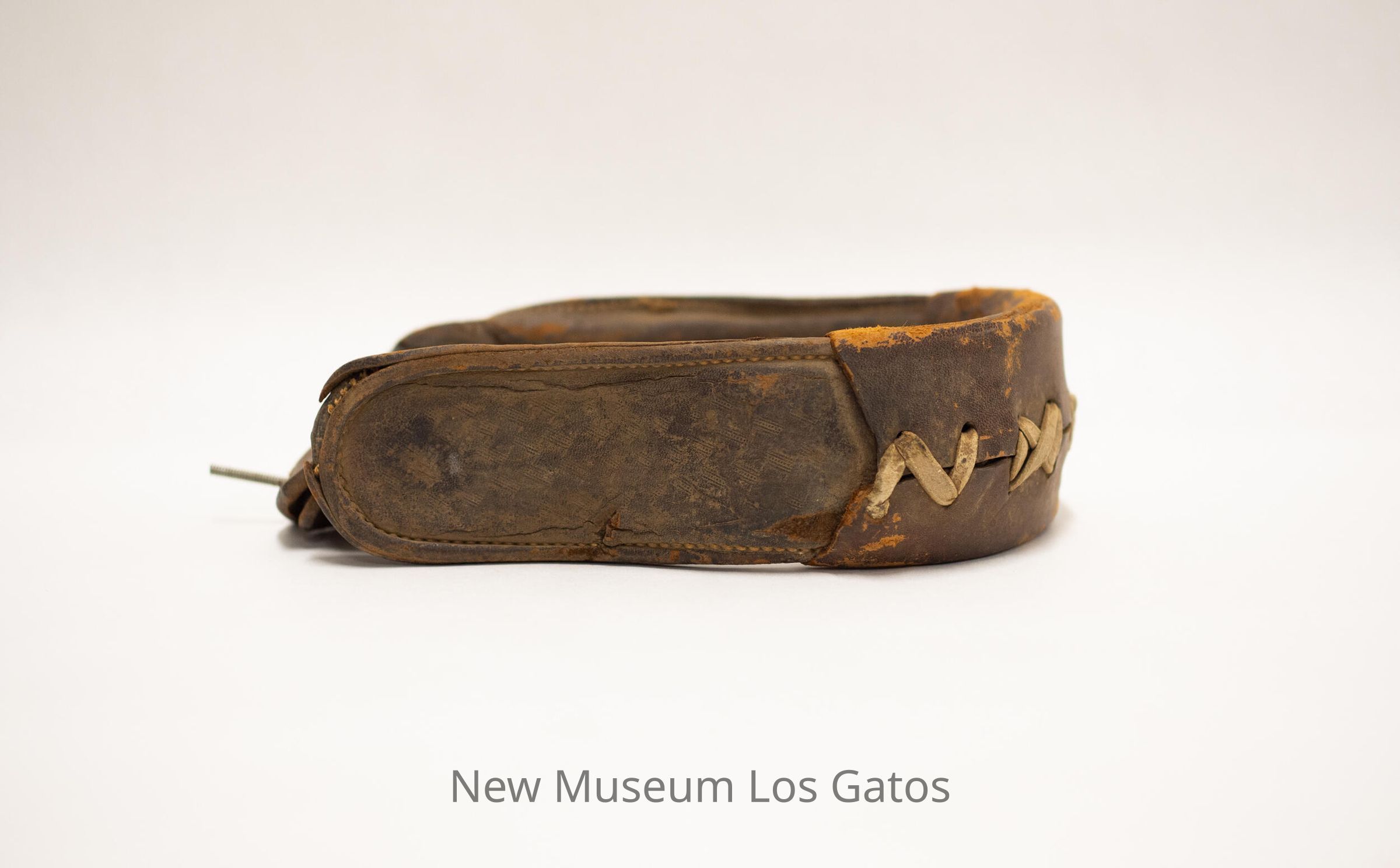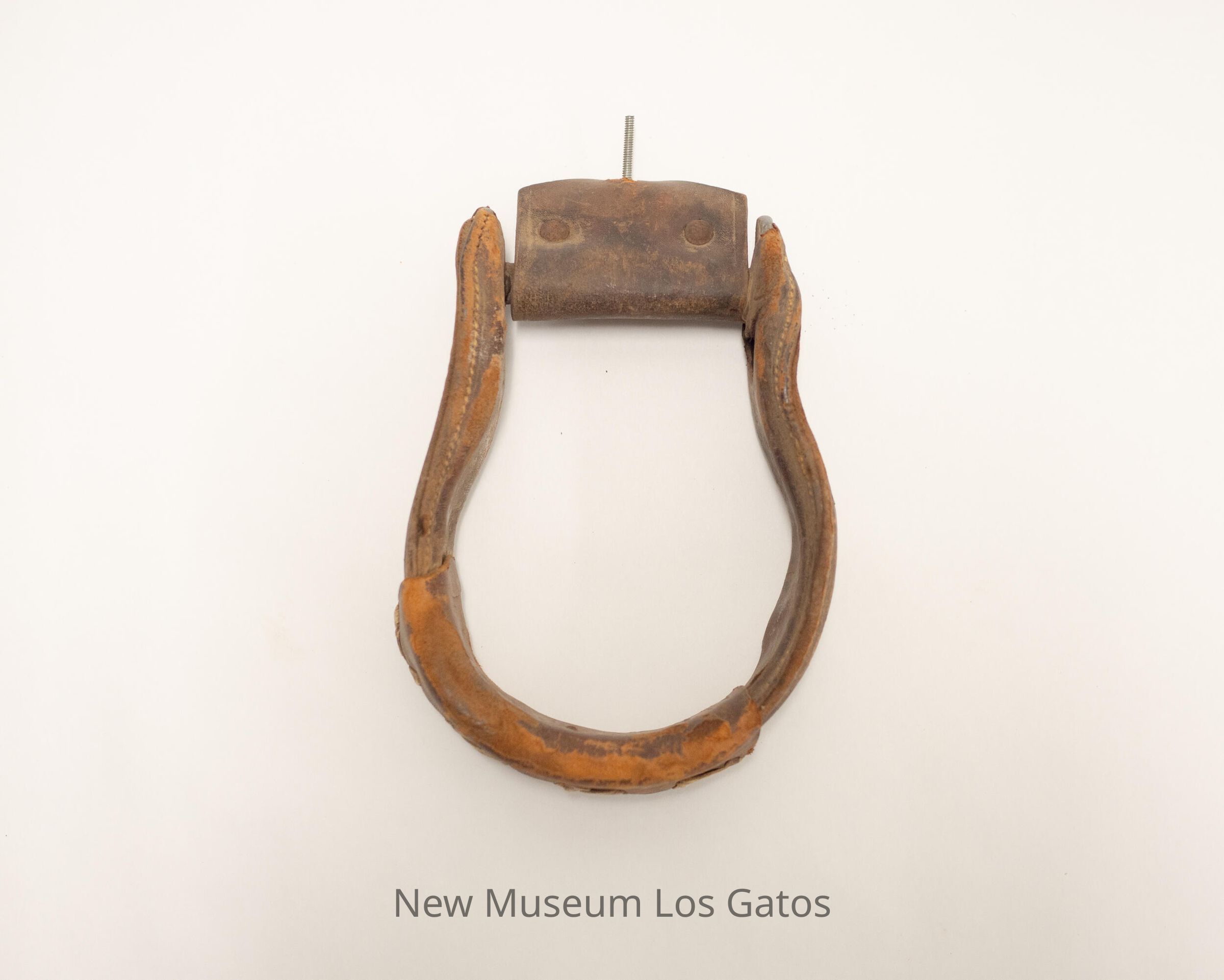 A U-shaped piece of metal covered in leather, with a moveable piece of metal also covered in leather across the opening. There is a screw coming out of the small, moveable piece.