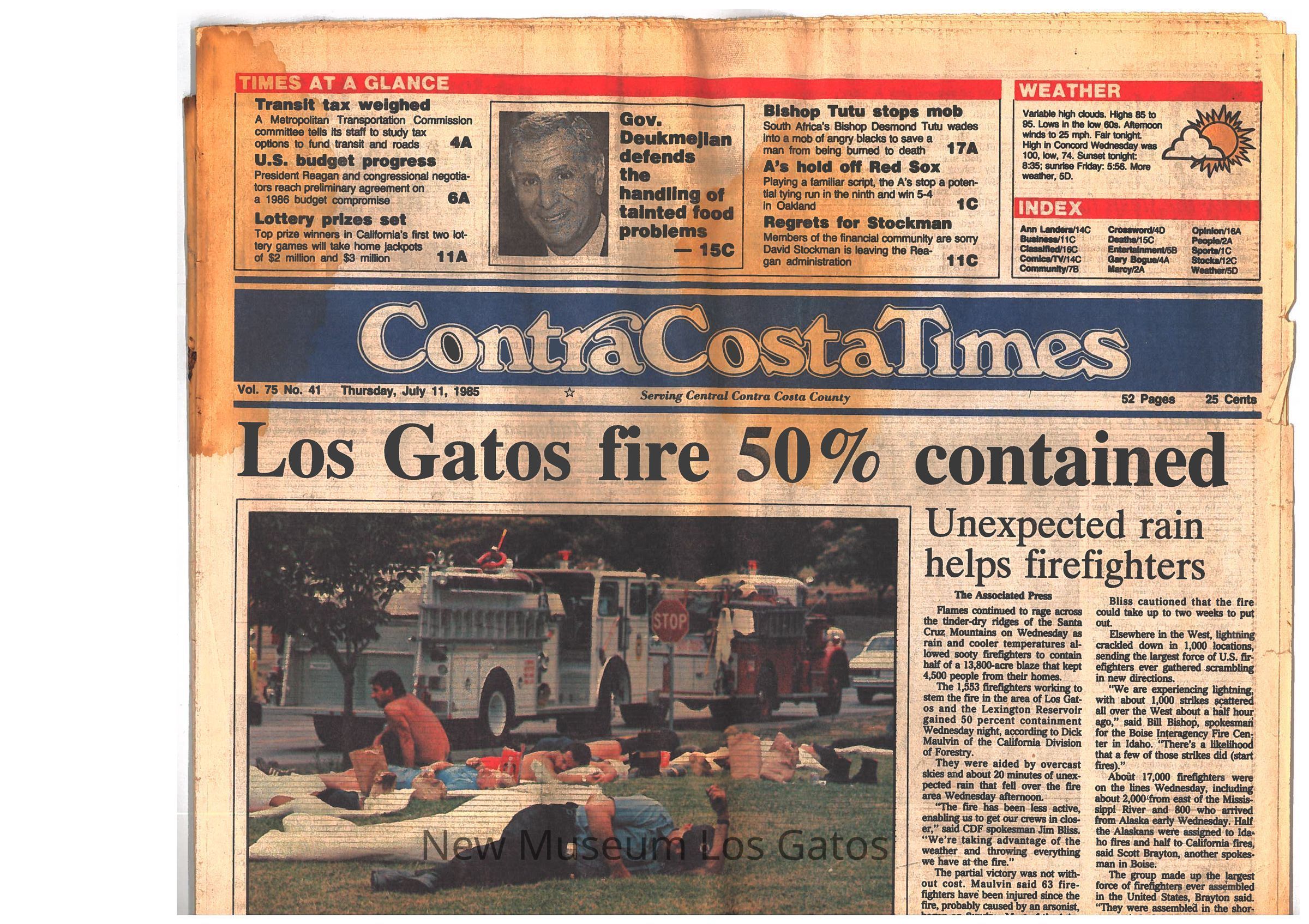 A newspaper with numerous articles and advertisements. The front page article is about the Los Gatos fire of 1985 near Lexington Reservoir.Collection