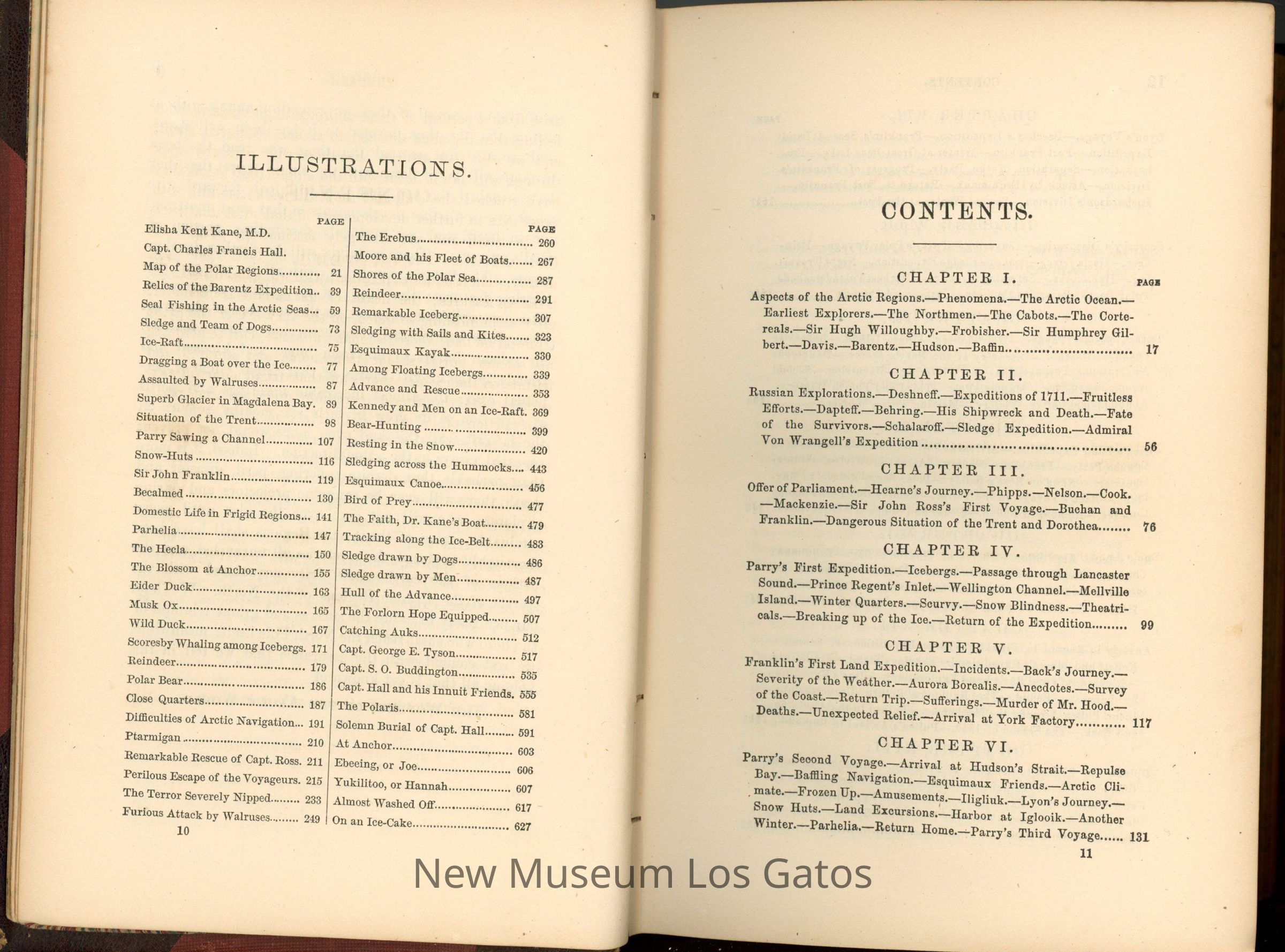 A two-tone red and black fabric and leather-bound book about early expeditions to the Arctic region.Collection