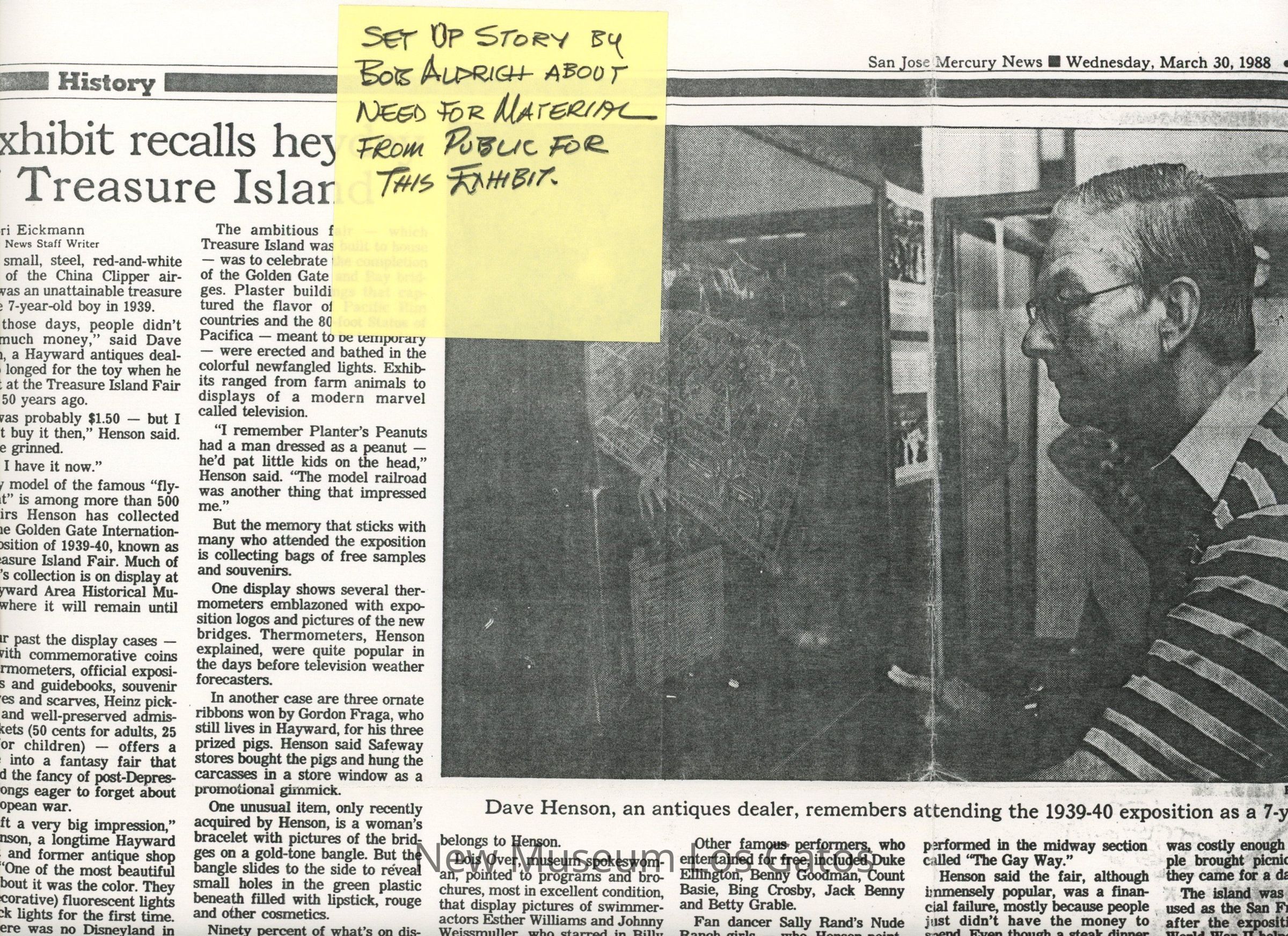 Black and white photocopy of a clipping from the San Jose Mercury News, from Wednesday March 30th, 1988. The clipped article is about an exhibit at the Hayward Area Historical Museum on the Golden Gate International Exposition at Treasure Island in 1939. There is a yellow sticky-note attached to the paper. The paper has a large photograph of Dave Henson looking at a map of the exposition.Collection