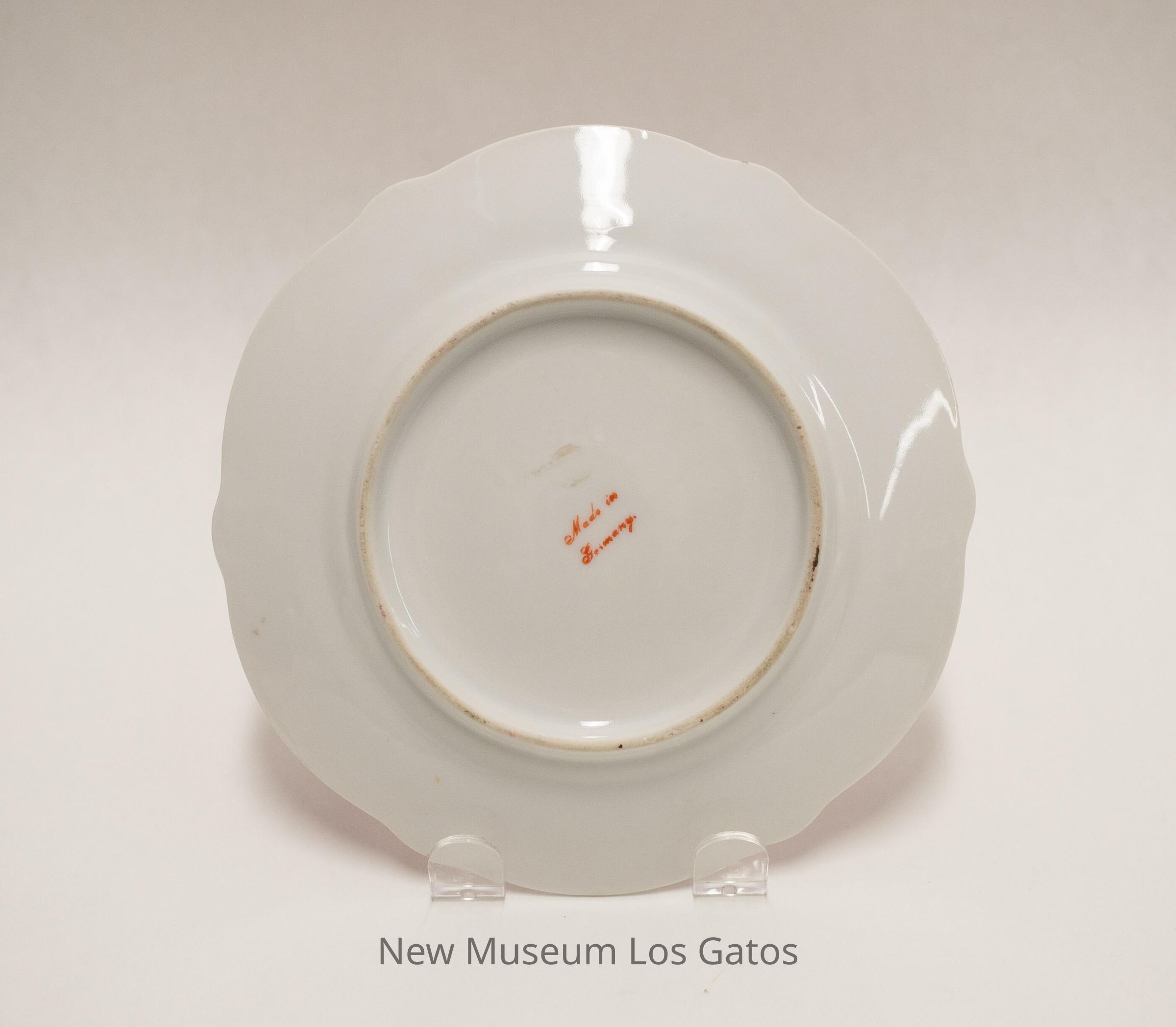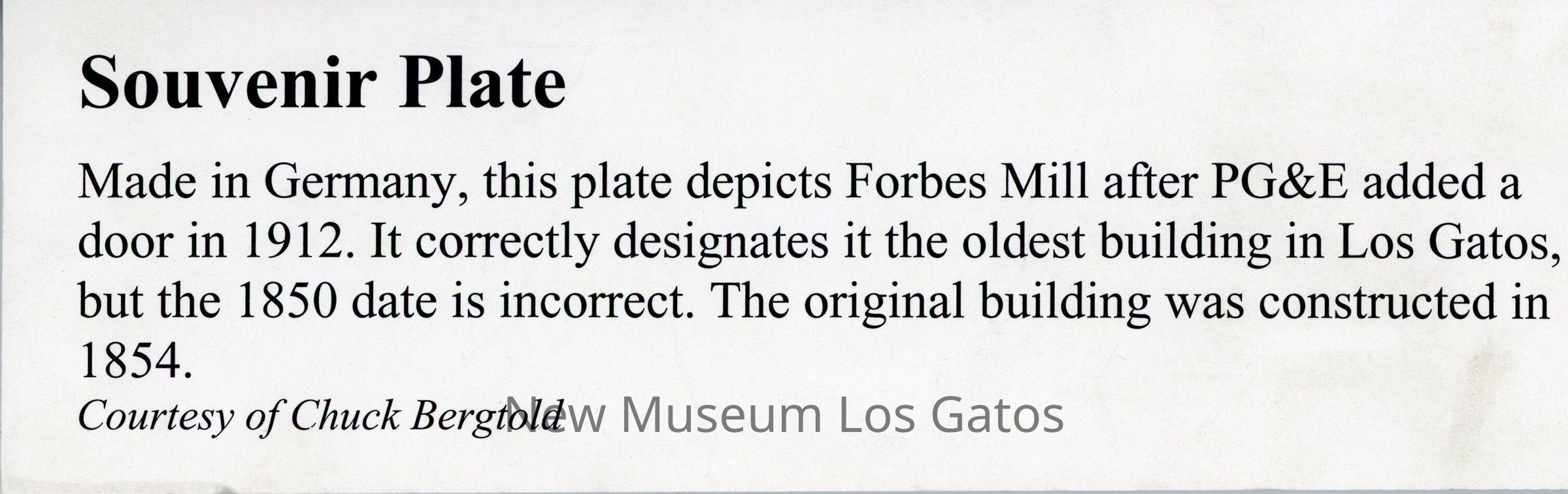 A white and pink commemorative plate, with a colorful illustration in the center. The pink color is around the rim of the plate, along with raised decorative dots and floral embellishments. The illustration depicts Forbes Mill, with an inscribed banner underneath.Collection