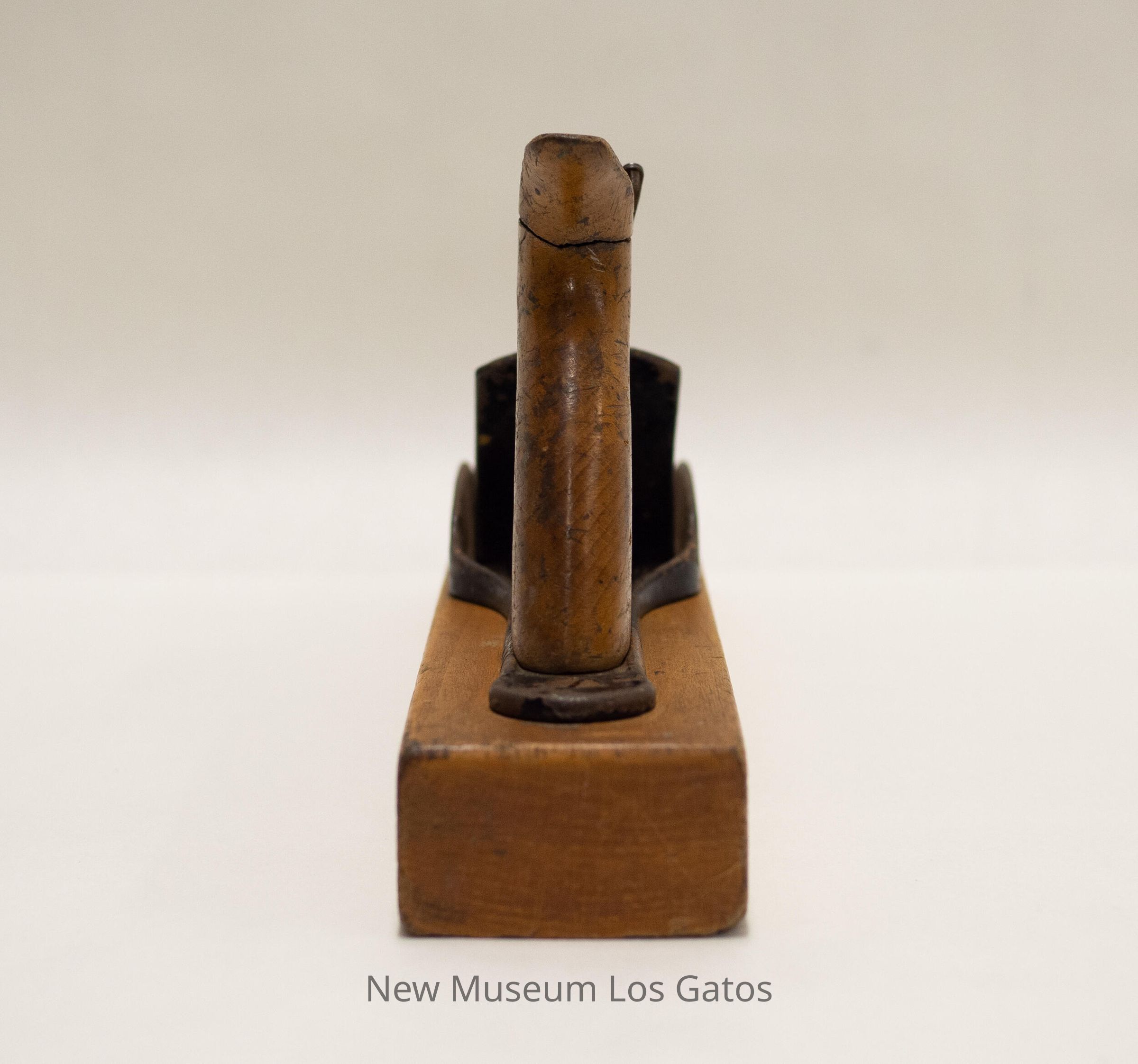 A long, antique transitional plane, with a thin, wooden rectangular base. There is metal on top of the base, with a metal blade and metal chip breaker angled into an opening in the center. There is a wooden knob towards the front of the plane, and a wooden handle towards the back of the plane.Collection