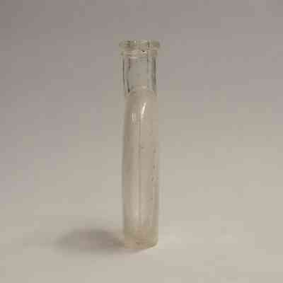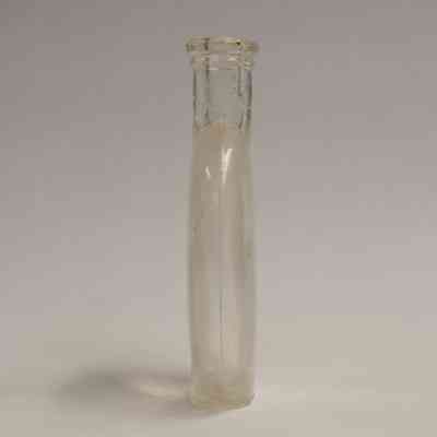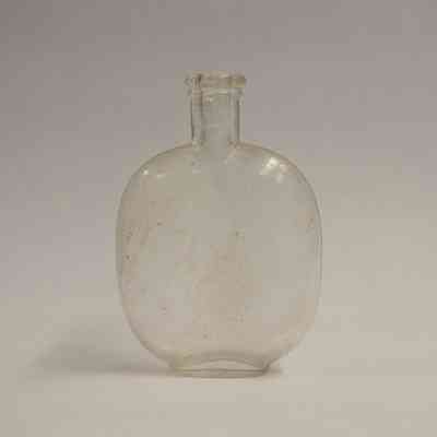 A clear, glass "pumpkin seed" flask, so named because it resembles a pumpkin seed. The neck is short, and there is some generic embossing on one side of the bottle.Collection