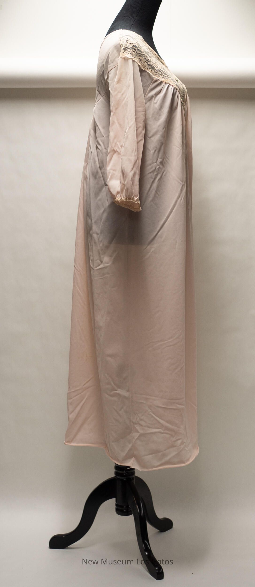 A long, light pink nylon nightgown. There is beige lace trim along the neckline, which is shaped like a 'V.' There is also lace trim at the end of the sleeves. There are two small white, pink, and green decorative fabric flowers in the center of the lace.Collection