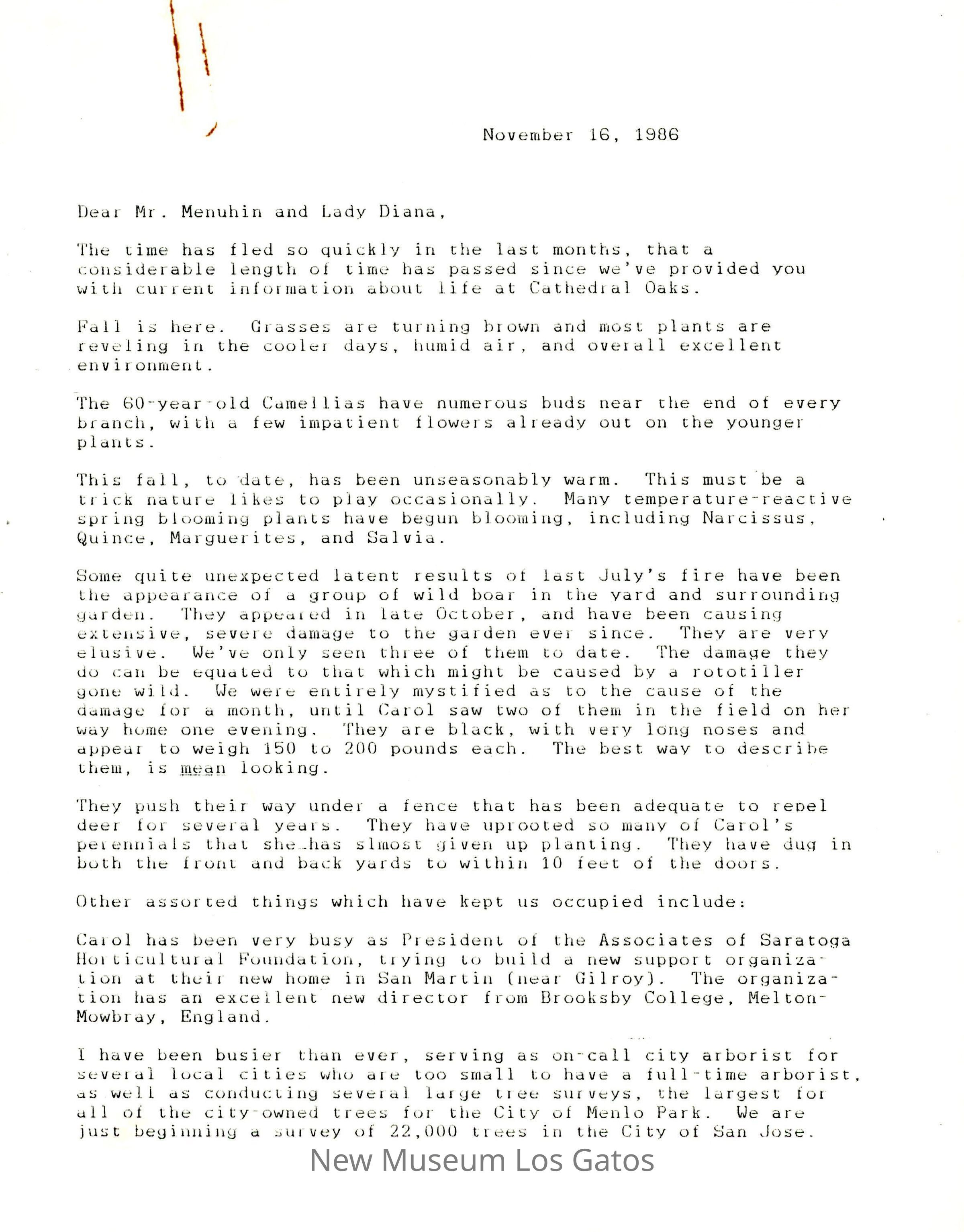 A three page personal letter discussing the Cathedral Oaks property, from Carol and Barrie Coate to Yehudi and Diana Menuhin. The letter is dated November 16, 1986.Subject Place