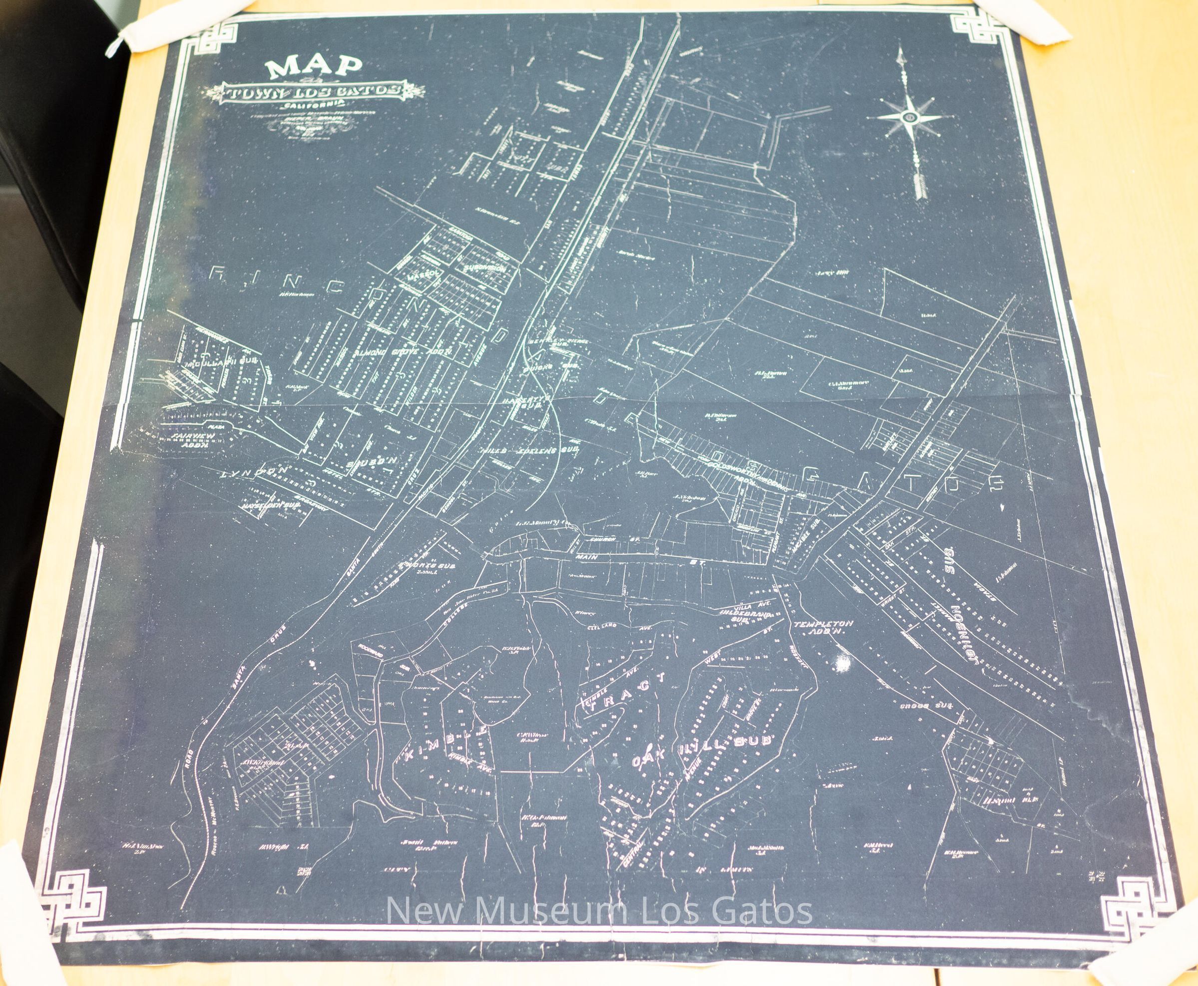 Two identical blueprint/maps of the Town of Los Gatos, from 1891. Paper is dark blue, with a white border around map, and the map details are also in white. A label and information about the map is located in the upper left hand corner, also in white. Scale is 1" = 100'.Collection