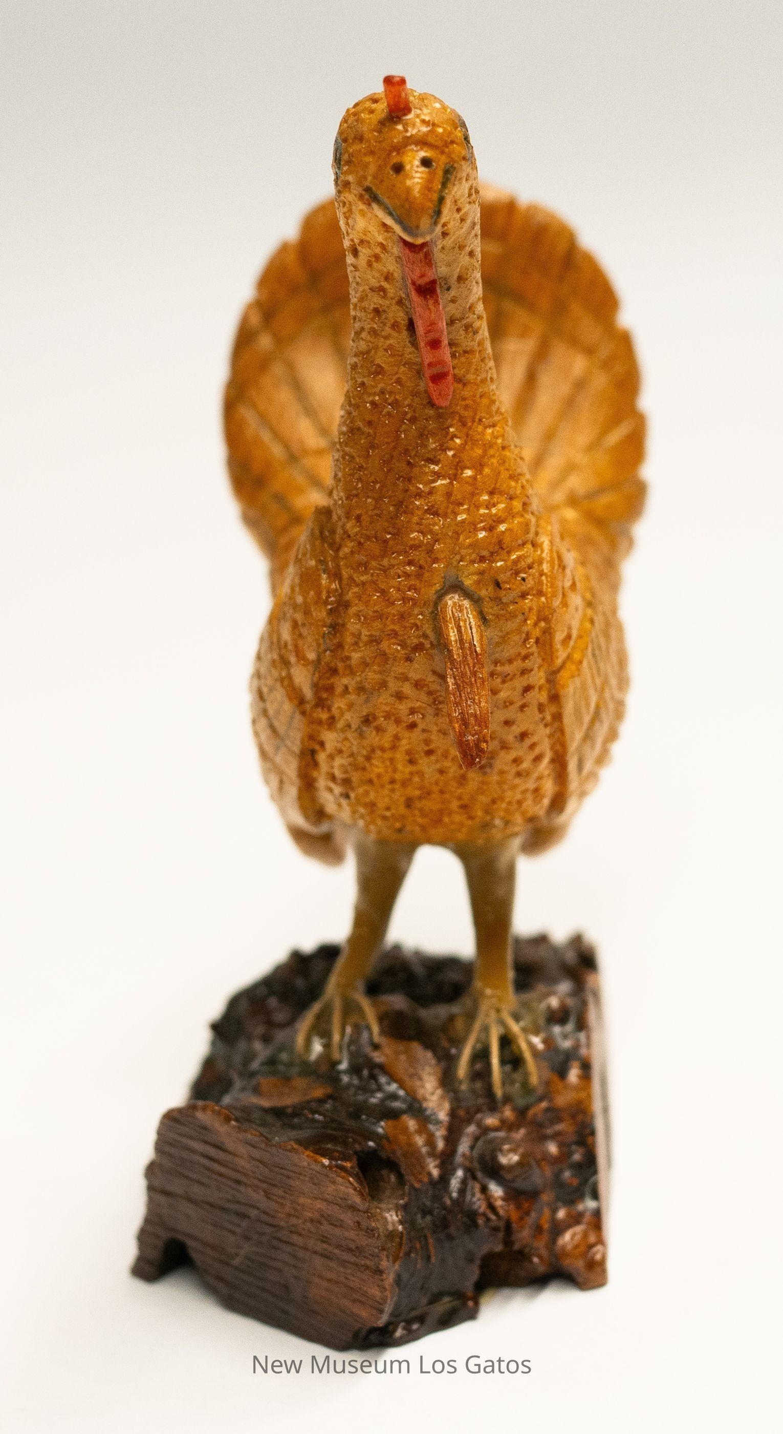 A light yellow hand-carved wooden sculpture of a White House turkey, with yellow legs, on a mottled brown base. The turkey has a red snood and wattle, with a light yellow beard. The tail feathers are angled upward, and the beak is closed.Type of Sculpture