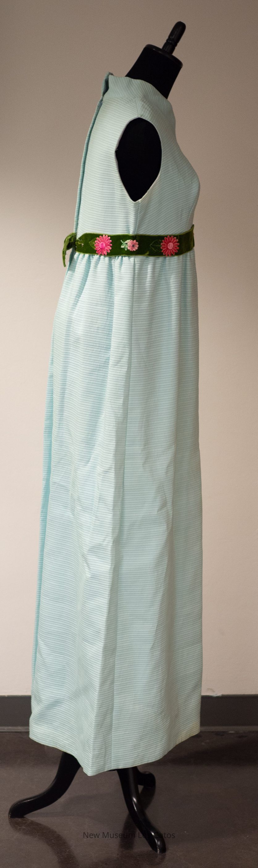 A long, sleeveless aquamarine dress. The fabric has small-scale horizontal stripes throughout. There is a velvet green waistband with pink floral decorative elements. The neckline is V-shaped. The dress opens in the back with a zipper.Collection
