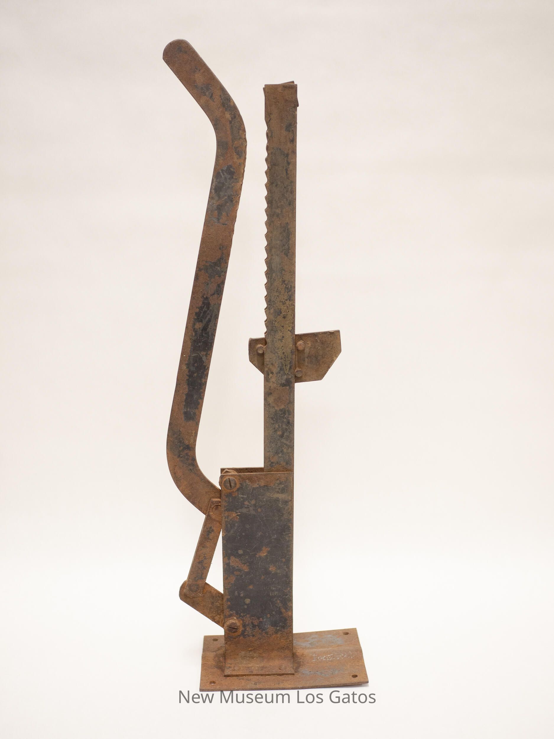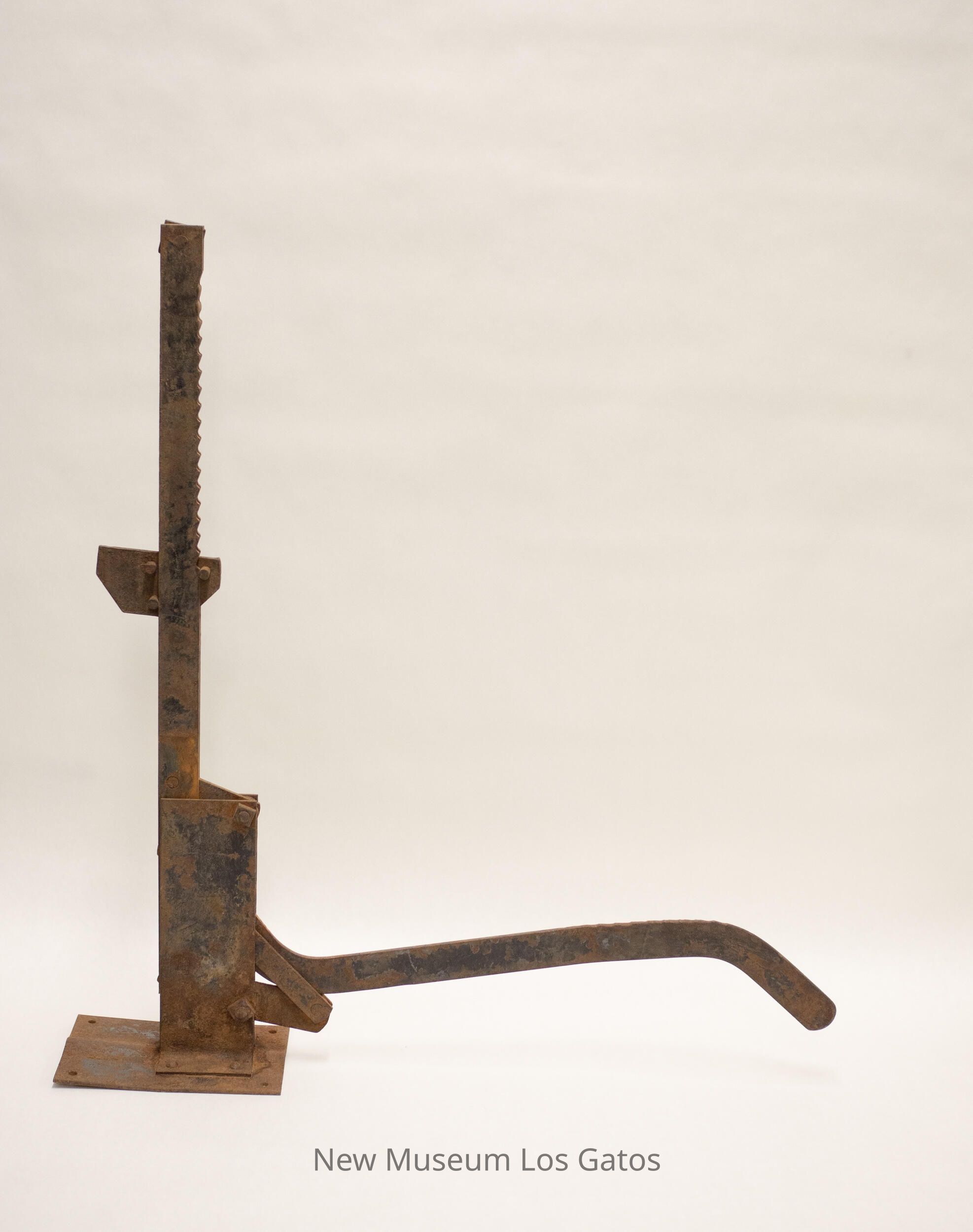Covered wagon wheel jack, consists of a base, with a handle that pushes the ridged center rectangular piece up and down.Collection