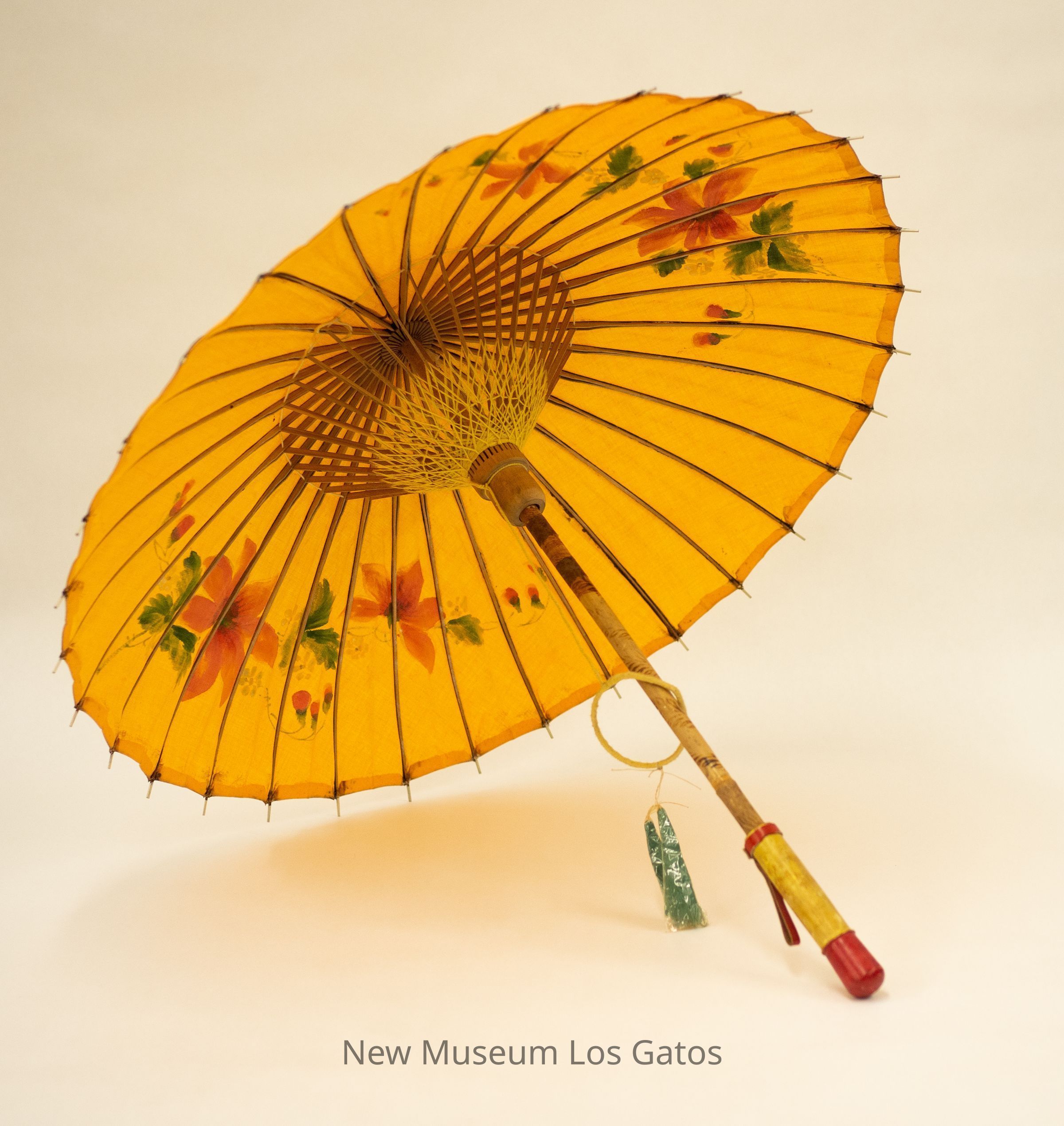 A collapsible orange parasol, with a wooden stick and handle. The umbrella cloth is light orange, with a hand-painted pink, white, and green floral pattern on the top. The point of the umbrella is painted black, with gold and silver script painted around it, possibly in Burmese. The stick portion of the handle has a darker brown leaf pattern on it, while the base of the handle is bulbous yellow, with a red strip at the top and red at the very end. The interior of the umbrella is supported with wooden supports, around which yellow string is woven. There is a ring around the handle that is covered in the same yellow yarn, coming out from that support structure, with two green tassels; when the umbrella is closed, the ring is used to secure it closed.Collection