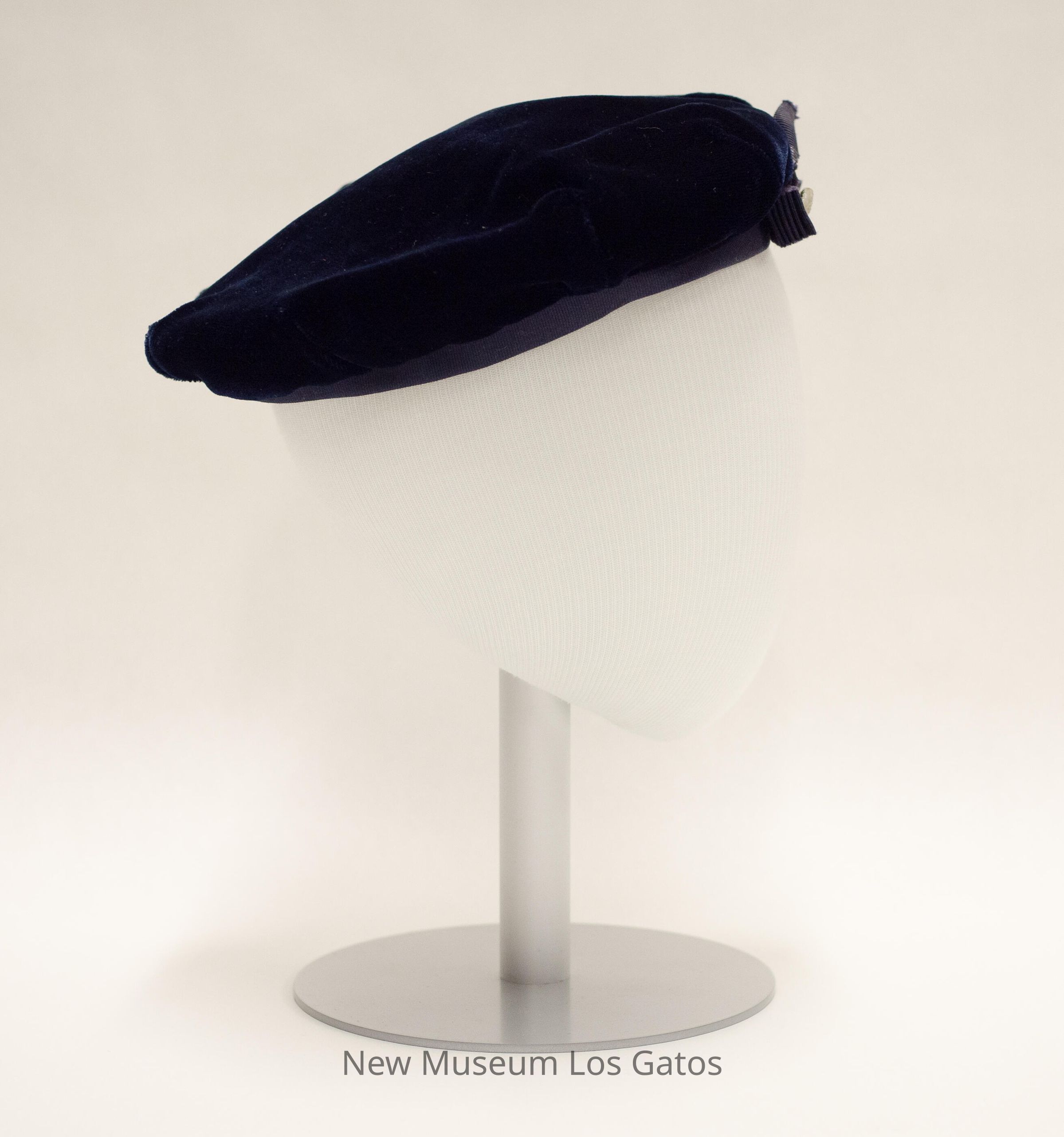 A navy blue velvet beret, with a blue ribbon bow and clear decorative button at the front of the beret. The interior of the beret is magenta.
