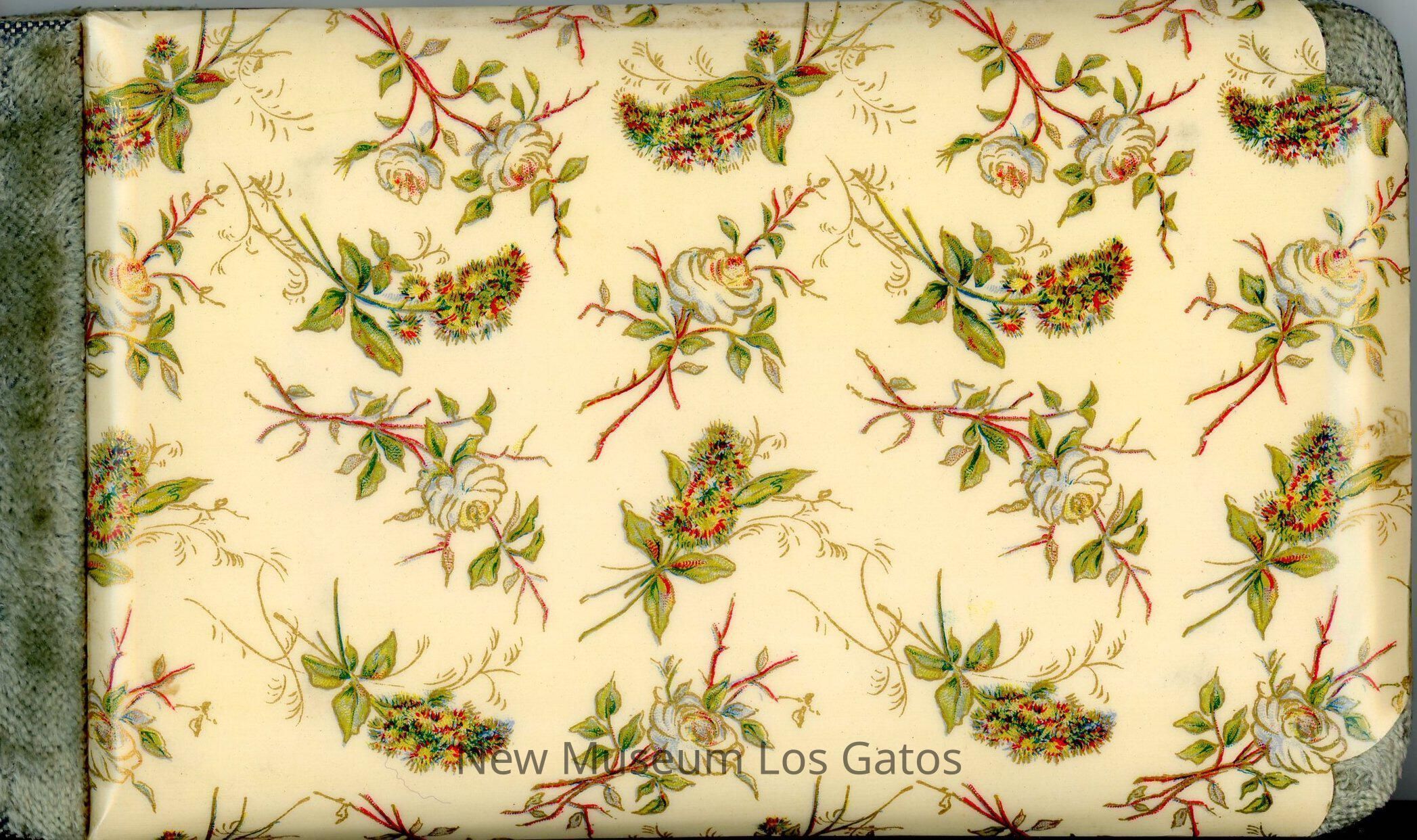 A small, rectangular autograph book. The covers of the book are white, with a green, red, and gold floral print. The binding of the book is green velvet. Inside the book are notes and well-wishes for the owner, Clara May, from her friends and relatives. There is also a folded American flag patch between two of the pages.Collection