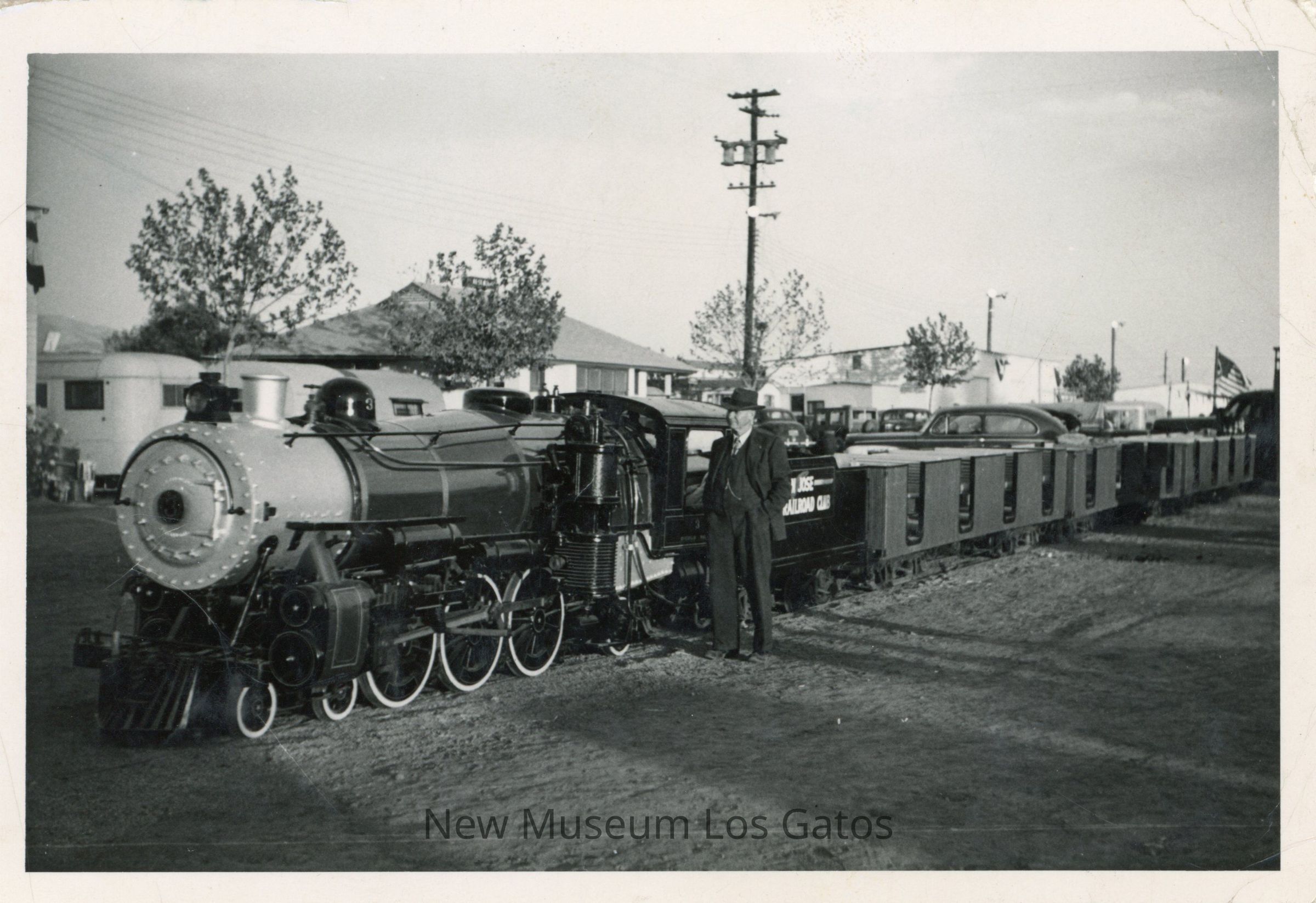 A black and white photograph featuring a San Jose Railroad Club train. The steam engine is attached to at least two passenger cars. There are buildings and trailers behind the train. There is a man, most likely Billy Jones, in a dark suit standing to the side of the engine. The image is surrounded by a white border.Photograph Details