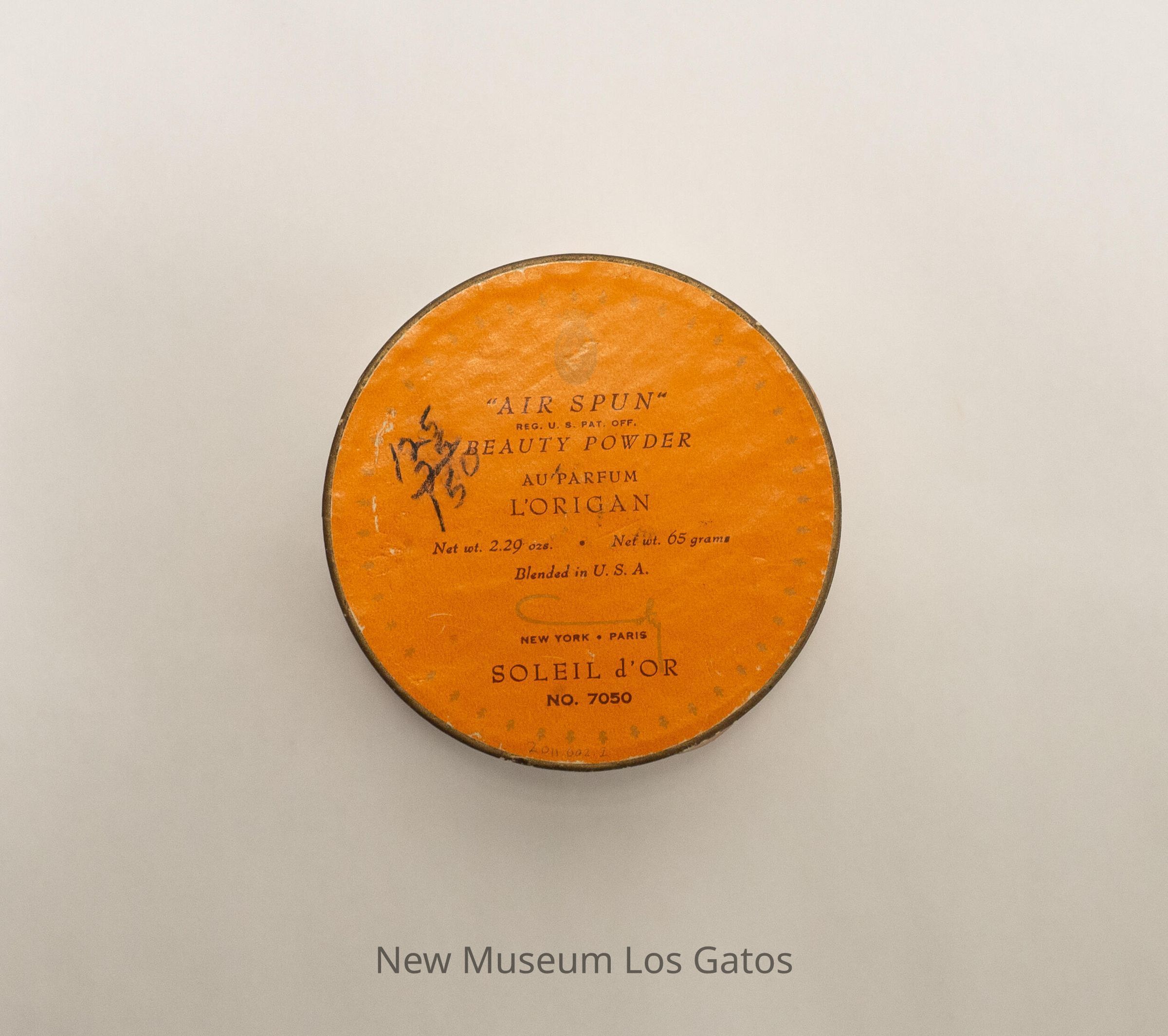 "AIR SPUN" / REG. U.S. PAT. OFF. / BEAUTY POWDER / AU PARFUM / L'ORIGAN / Net wt. 2.29 ozs. Net wt. 65 grams / Blended in U.S.A. / Coty NEW YORK PARIS / SOLEIL d'OR / NO. 7050Language