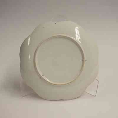 A white porcelain plate with scalloped edges. A large pink rose with two smaller pink roses and green leaves is hand-painted onto the plate. There are gold 'U' shapes along the border of the plate, with gold along the plate's edge as well.Collection