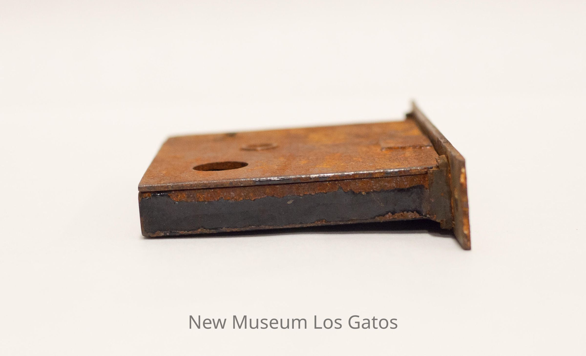 A door latch, consisting of a thin, square mechanism with a longer, thin metal rectangle attached to one side. The thin metal rectangle has a rectangular hole and a square hole in the center, with two circular holes at each end. The square mechanism has a circular hole through it towards the top and a keyhole hole through it towards the bottom, and opens to reveal two small metal pieces inside.Collection