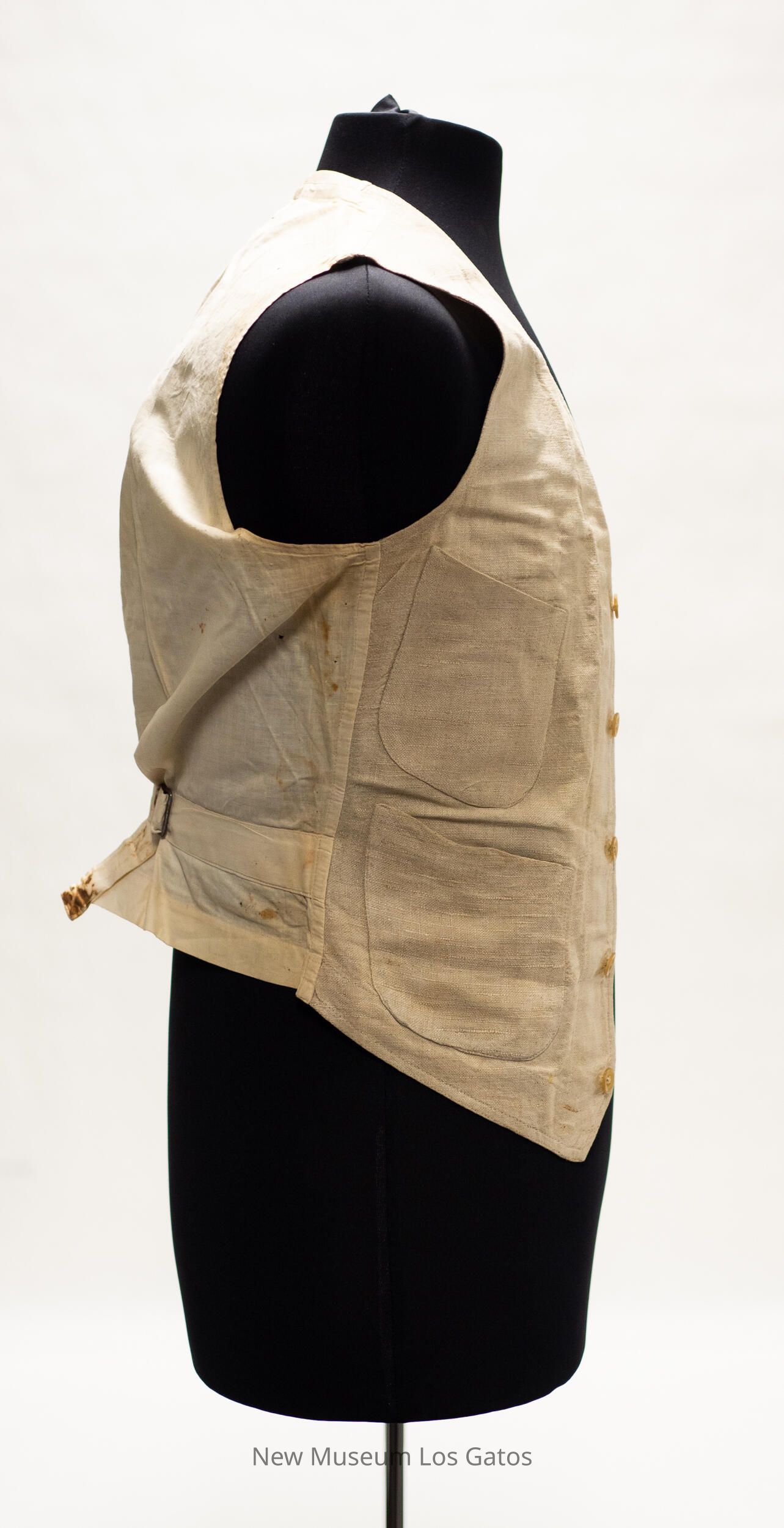 A pair of matching linen pants and vest. The pants are beige in color, and has two front pockets, two back pockets, and one small watch pocket in the very front. There are four belt loops around the waist, as well as two straps that connect with a metal buckle in the back of the pants. There are white buttons along the top of the pants, on the inside. The button-fly closes with four white buttons as well, and at the top of the fly is a brass hook. The vest is also beige in color, and has two pockets on each side of the vest, with one stacked above the other. The vest closes in the front with five light brown buttons. There is a strap along the lower back of the vest, that tightens with a metal buckle.Collection