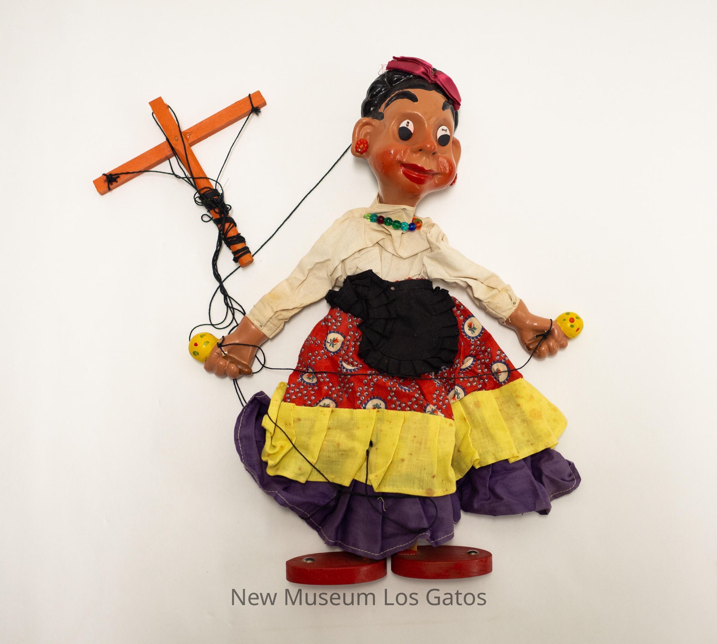 A large, female marionette. The marionette is wearing red wooden shoes, and a multicolored skirt consisting of a purple stripe at the bottom, a yellow stripe in the middle, and a red-and-blue floral patterned stripe at the top. The marionette is also wearing a white shirt and a black, ruffled apron. There are yellow maracas with red and green dots in each hand, and a multicolored beaded necklace around the neck. The marionette's face is painted on, her eyes are nailed on, allowing them to move. The marionette is wearing red floral earrings and has a magenta bow in her hair, which is braided and piled on the back. The marionette's limbs are attached via black string to an orange-ish wooden cross. There is a sticker with the number "65" attached to the back of the marionette.Collection