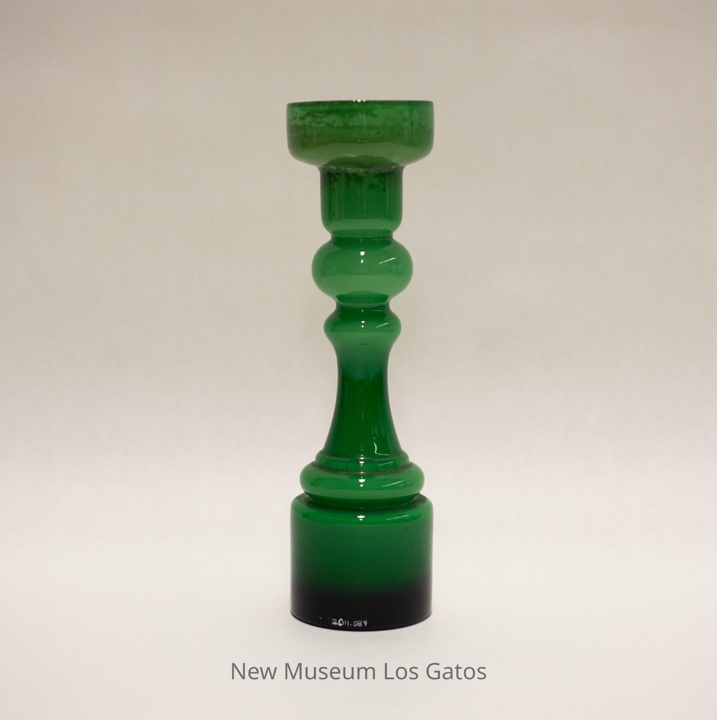 A glass vase, that is black at the bottom, and green throughout the rest. It has a thick base, tapers and has some ridges in the middle, and opens up at the top, almost resembling a candelabra.Collection