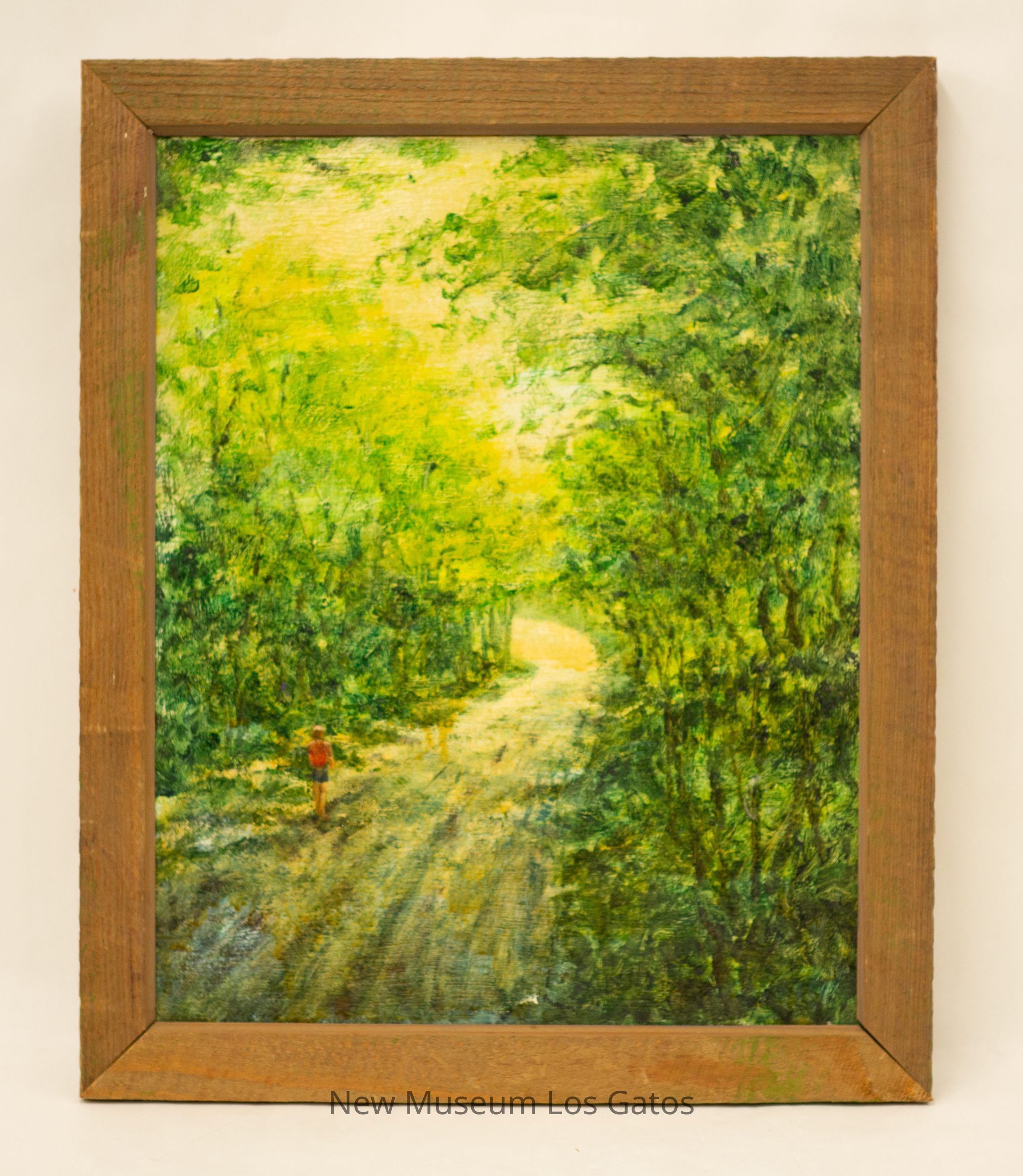 A painting of a person in a red shirt from behind on a forest path.