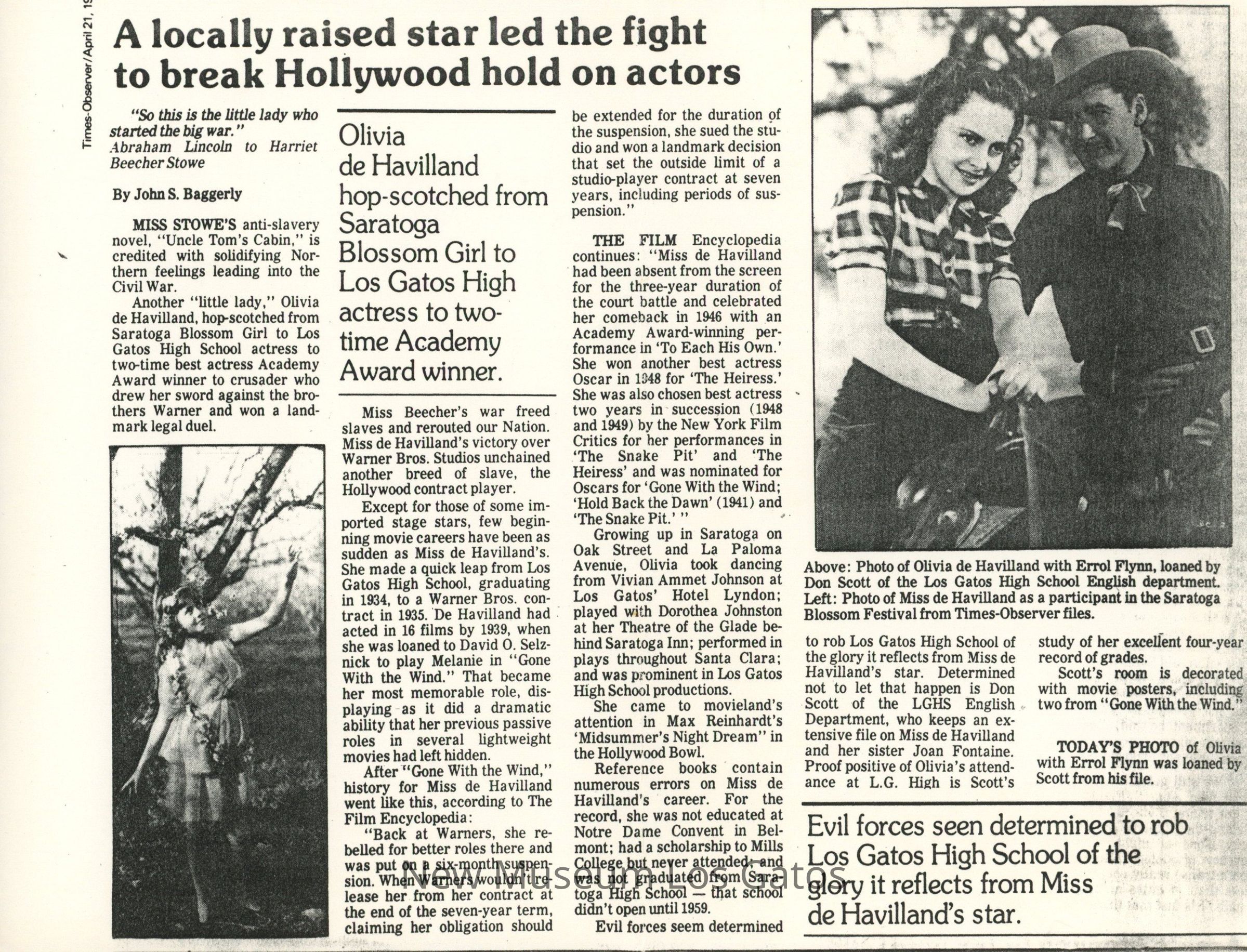 Two identical photocopies of a clipping from the Los Gatos Times-Observer from April 21st, 1987, of an article regarding Olivia deHavilland's fight against the studio system in Hollywood.Collection