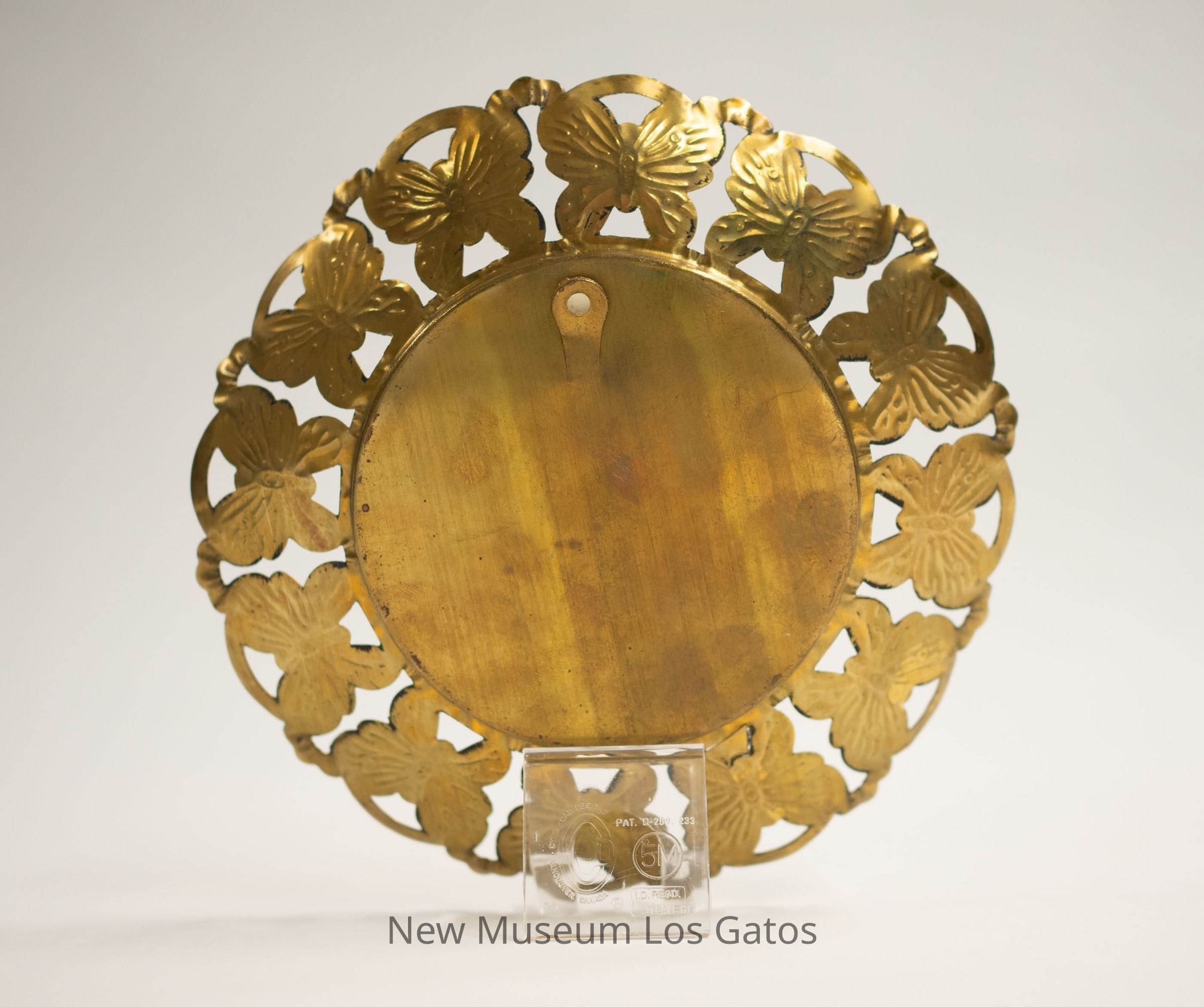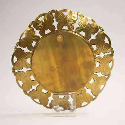 A brass decorative wall hanging, featuring a reproduction of Sir Thomas Lawrence's painting "The Red Boy" in the center. The painting features seven year old Charles William Lambton, dressed in red, sitting on a brown chair with one leg underneath him, and an arm resting on his head. The print is surrounded by connecting brass butterflies.Collection