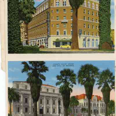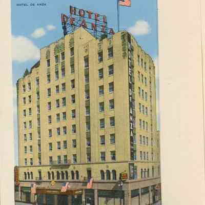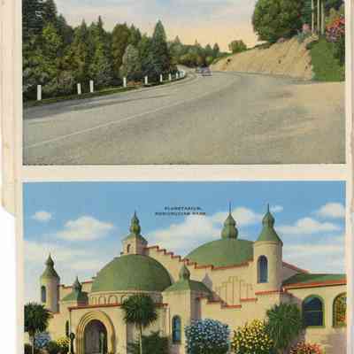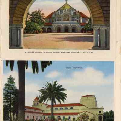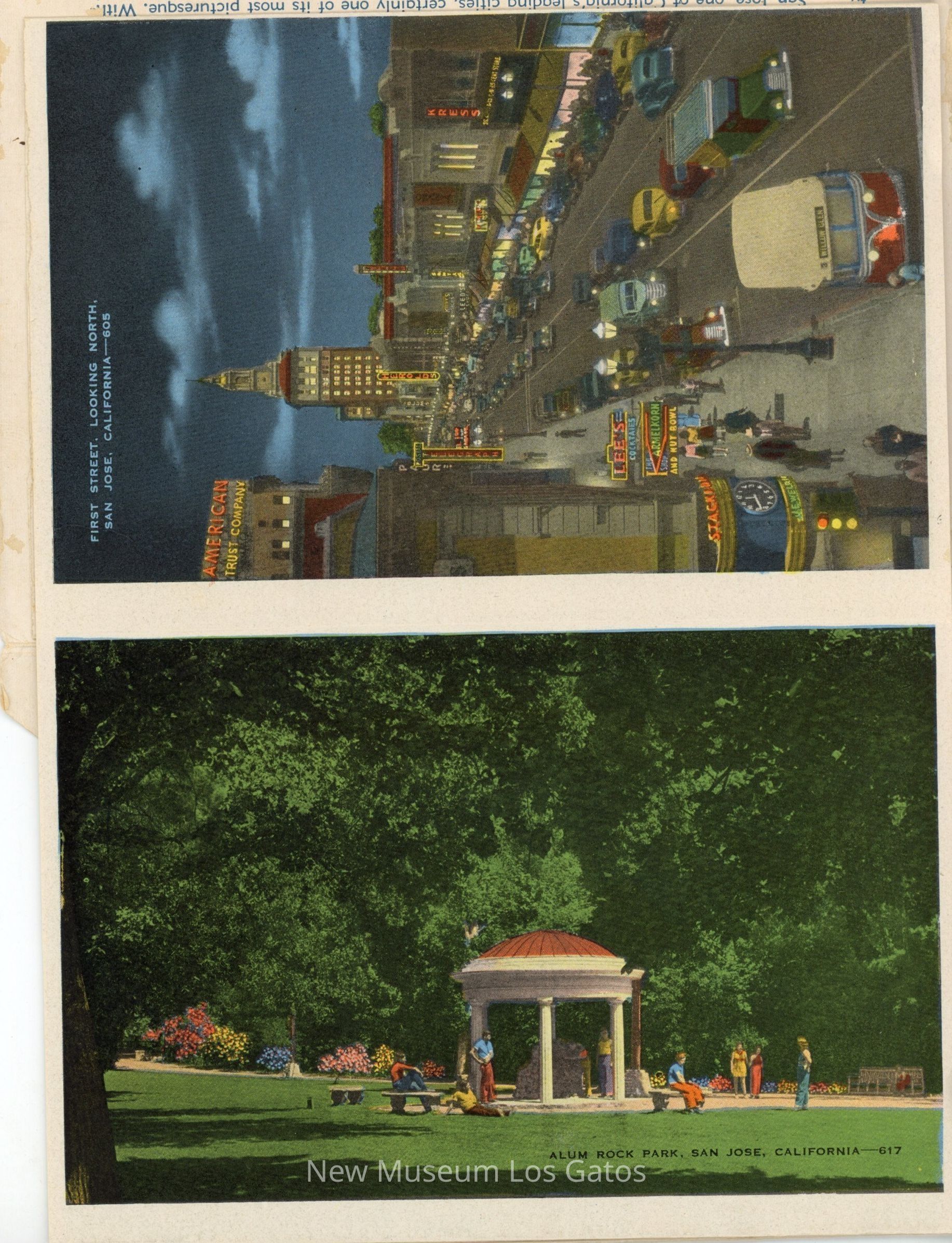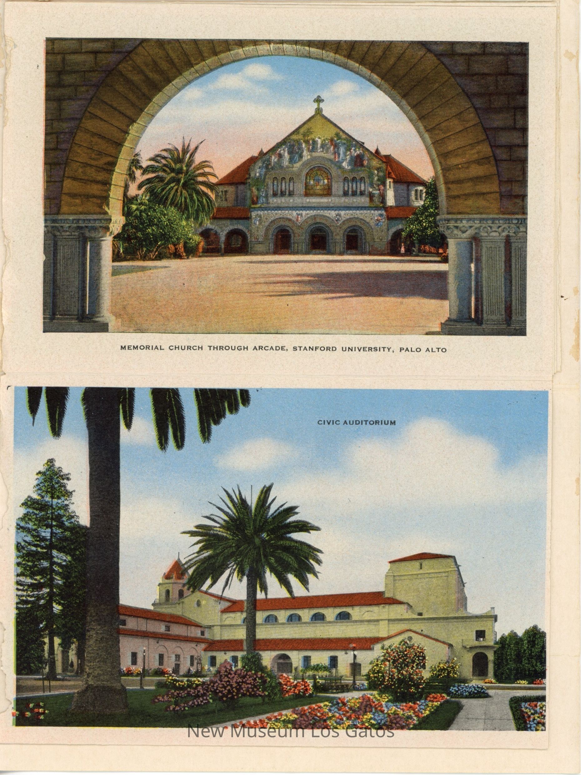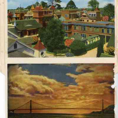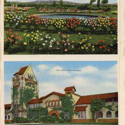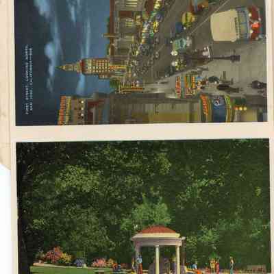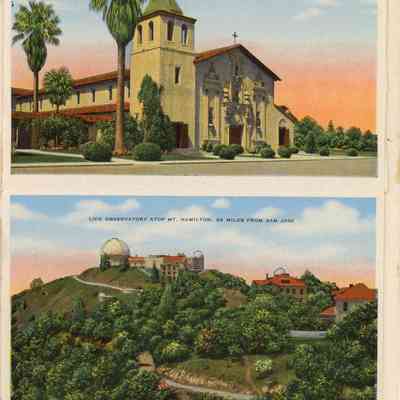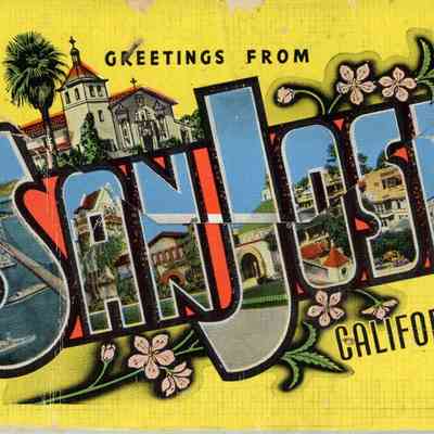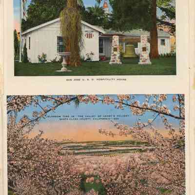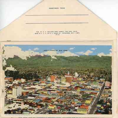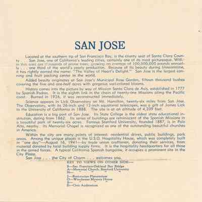 A colorfully-illustrated yellow and blue envelope, inside of which is an attached pullout of various illustrated San Jose sights, including the USO Hospitality House, Mission Santa Clara, Lick Observatory, the Municipal Rose Garden, San Jose State College, the Memorial Church at Stanford, the Civic Auditorium, the Hotel De Anza, Alum Rock Park, the Rosicrucian Planetarium, the Hotel Sainte Claire, the County Courthouse, and the Winchester Mystery House.Collection