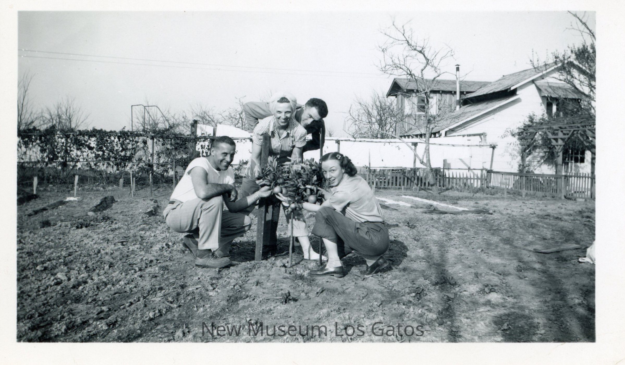 A black and white photograph featuring an unidentified group of people in a field. There are four people surrounding a small tree in the center of the image; a woman crouching to the right, a man crouching to left, and a man standing behind a standing woman, behind the tree. There is also a house/building the background The image is surrounded by a white border.Collection