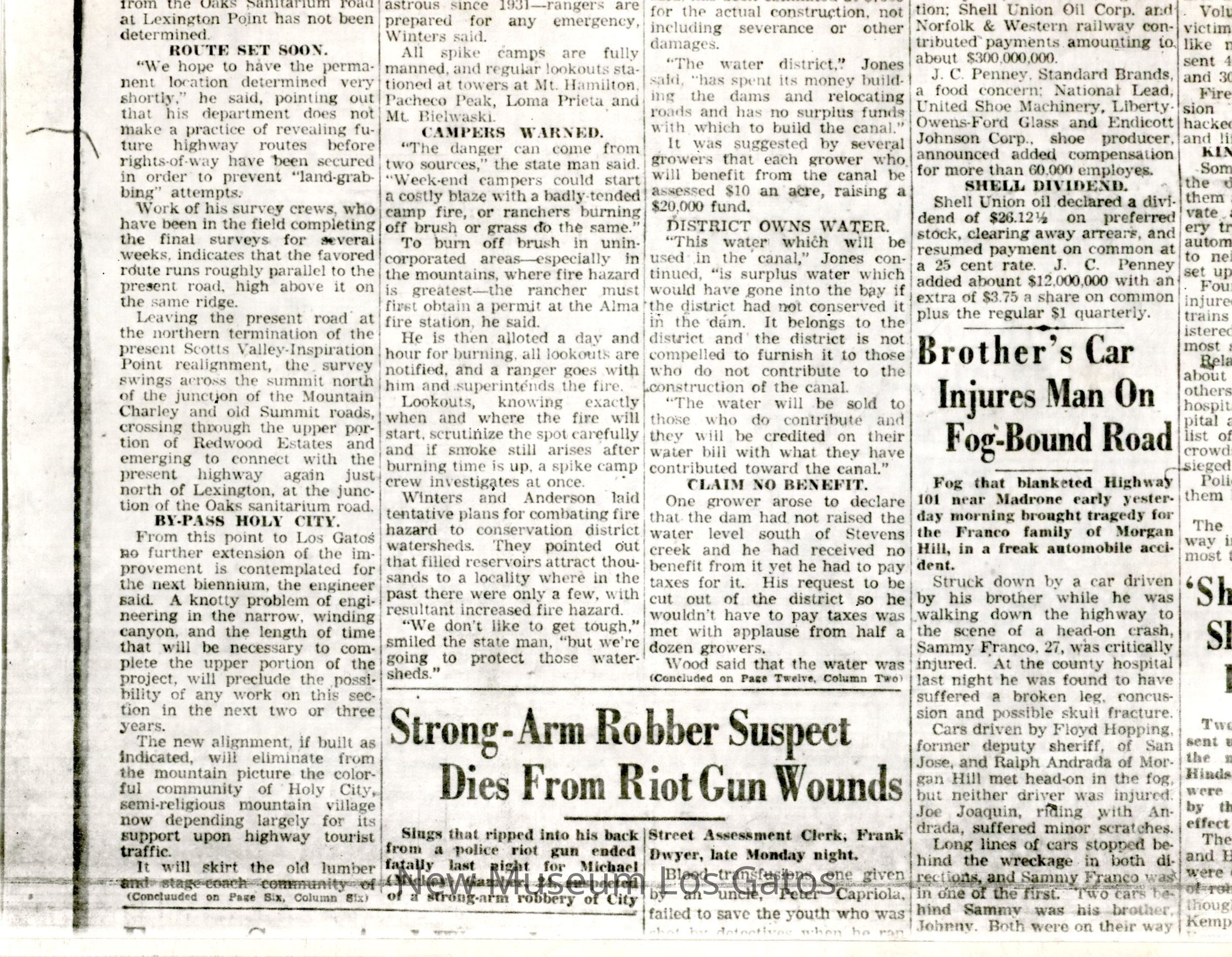 Photocopy of a San Jose-based newspaper publication from the morning edition of November 25th 1921 (date indicated by inscription). Relevant article describes planned construction and realignment of highway connecting Santa Cruz and Los Gatos.Collection