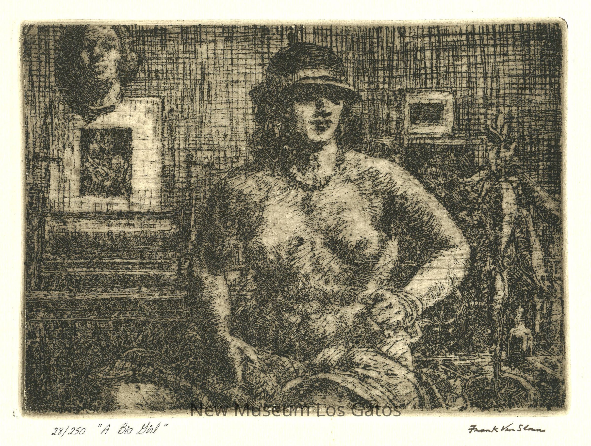 A monochrome print of a seated nude woman wearing a hat.