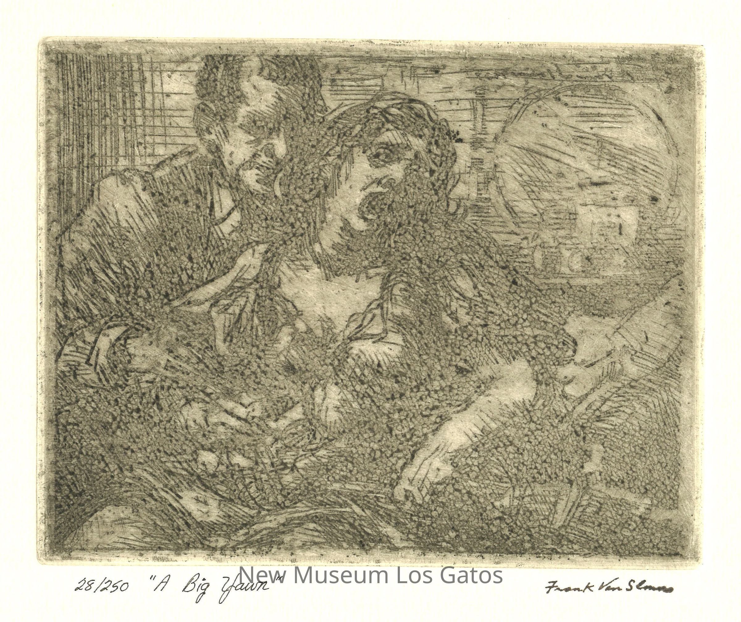 A monochrome print of a woman yawning, with a man on her left. The print is hinge mounted onto a mat board.