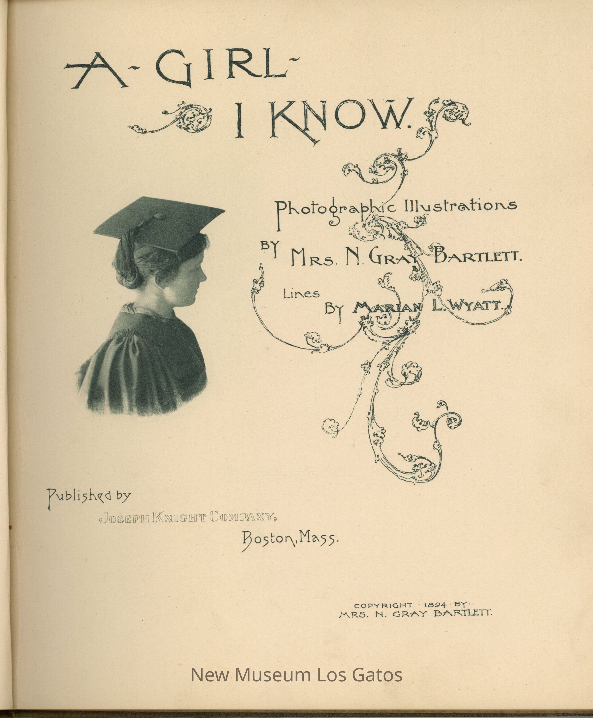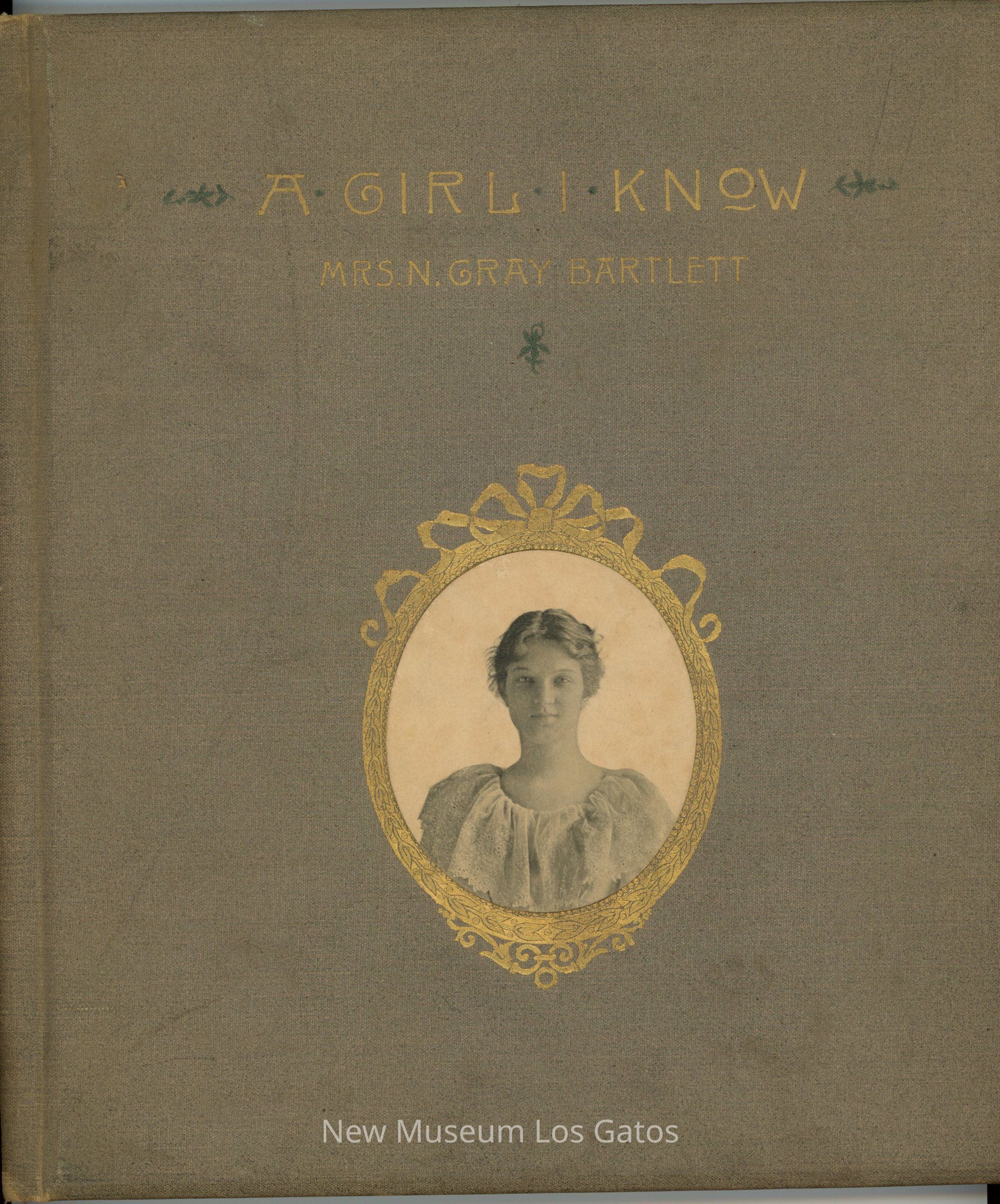 A thin brown/gray, fabric-bound book. The front cover features a black and white portrait of a girl, inside of a gilded frame, with gilded lettering. The interior pages are cardboard, and feature photographs as well as small sketches as illustrations.Collection