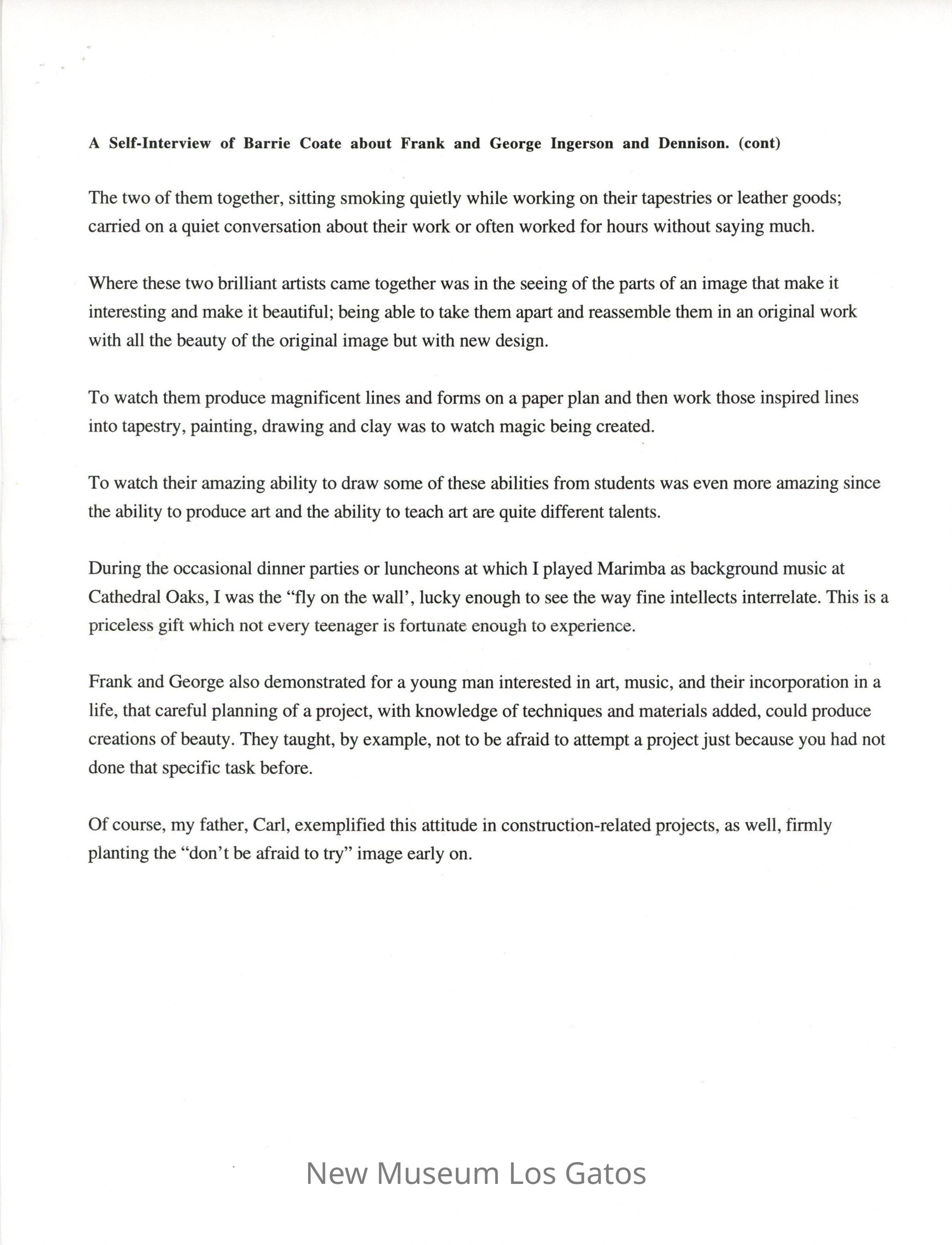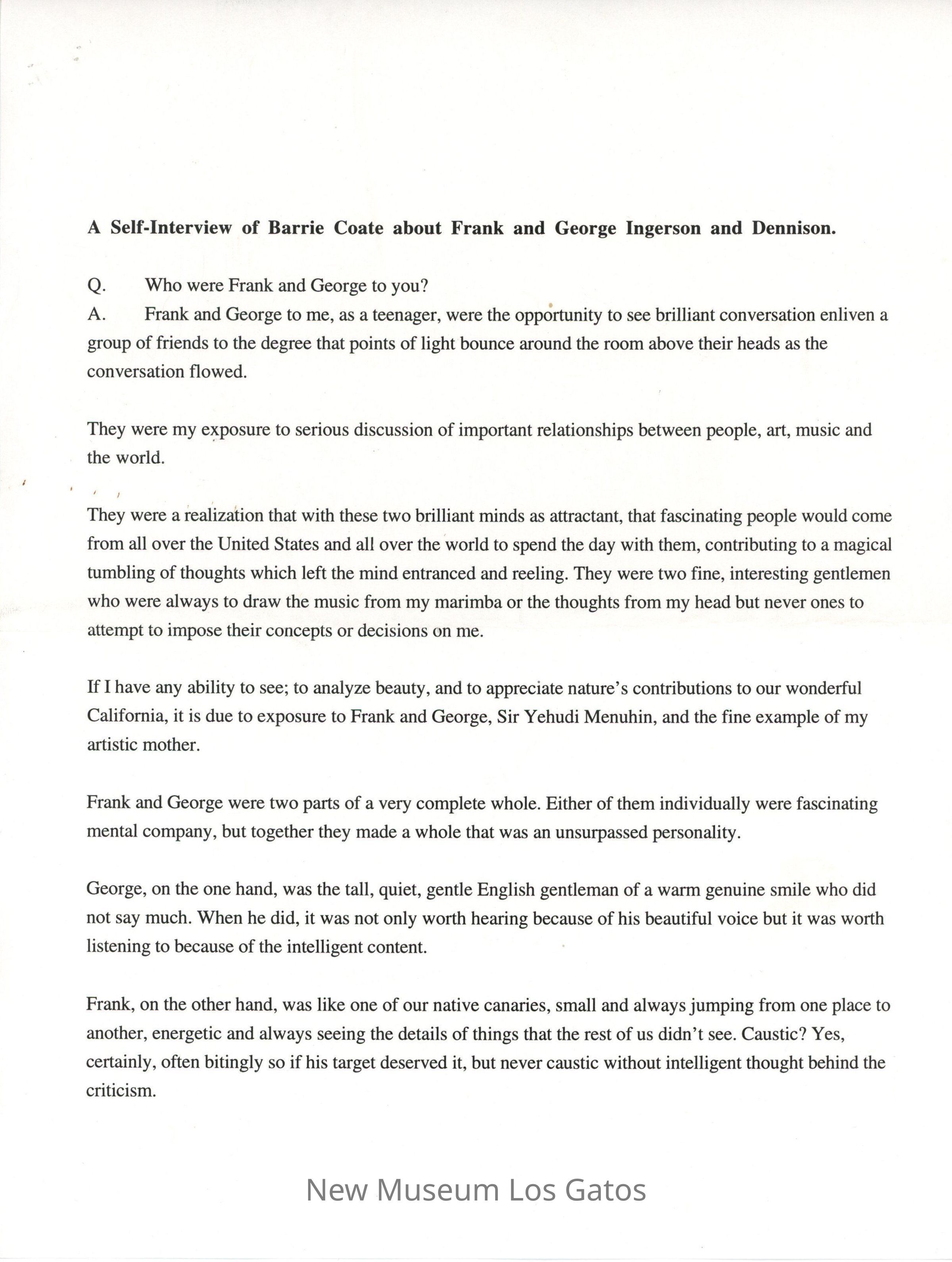 A Self-Interview of Barrie Coate about Frank and George Ingerson and Dennison.Entry/Object ID
