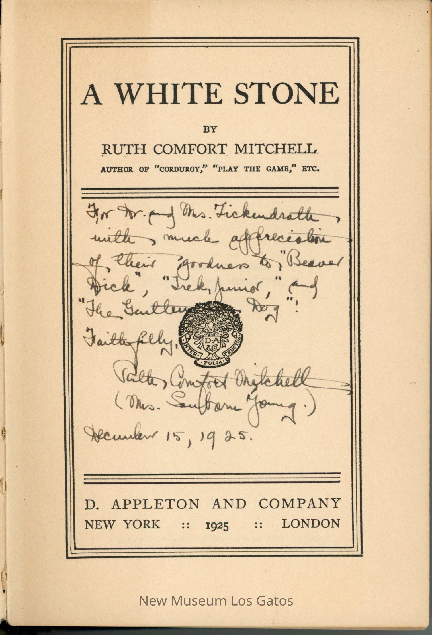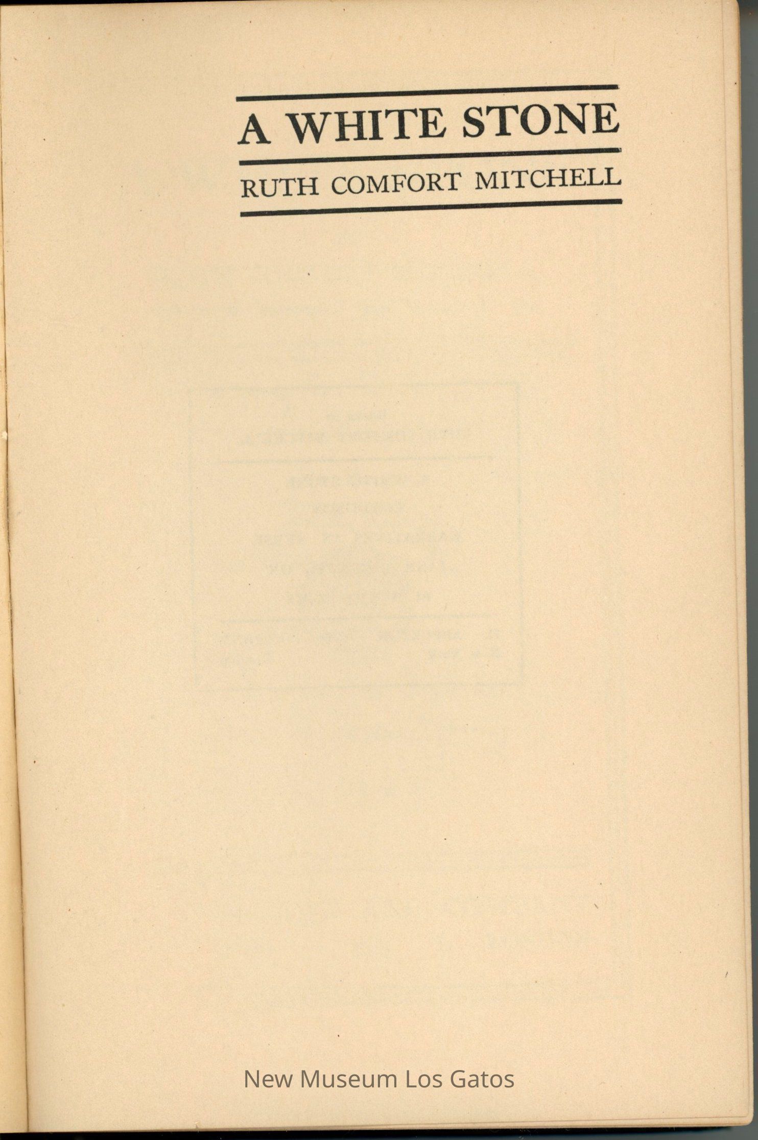 A green fabric-bound, signed copy of "A White Stone" by Ruth Comfort Mitchell.