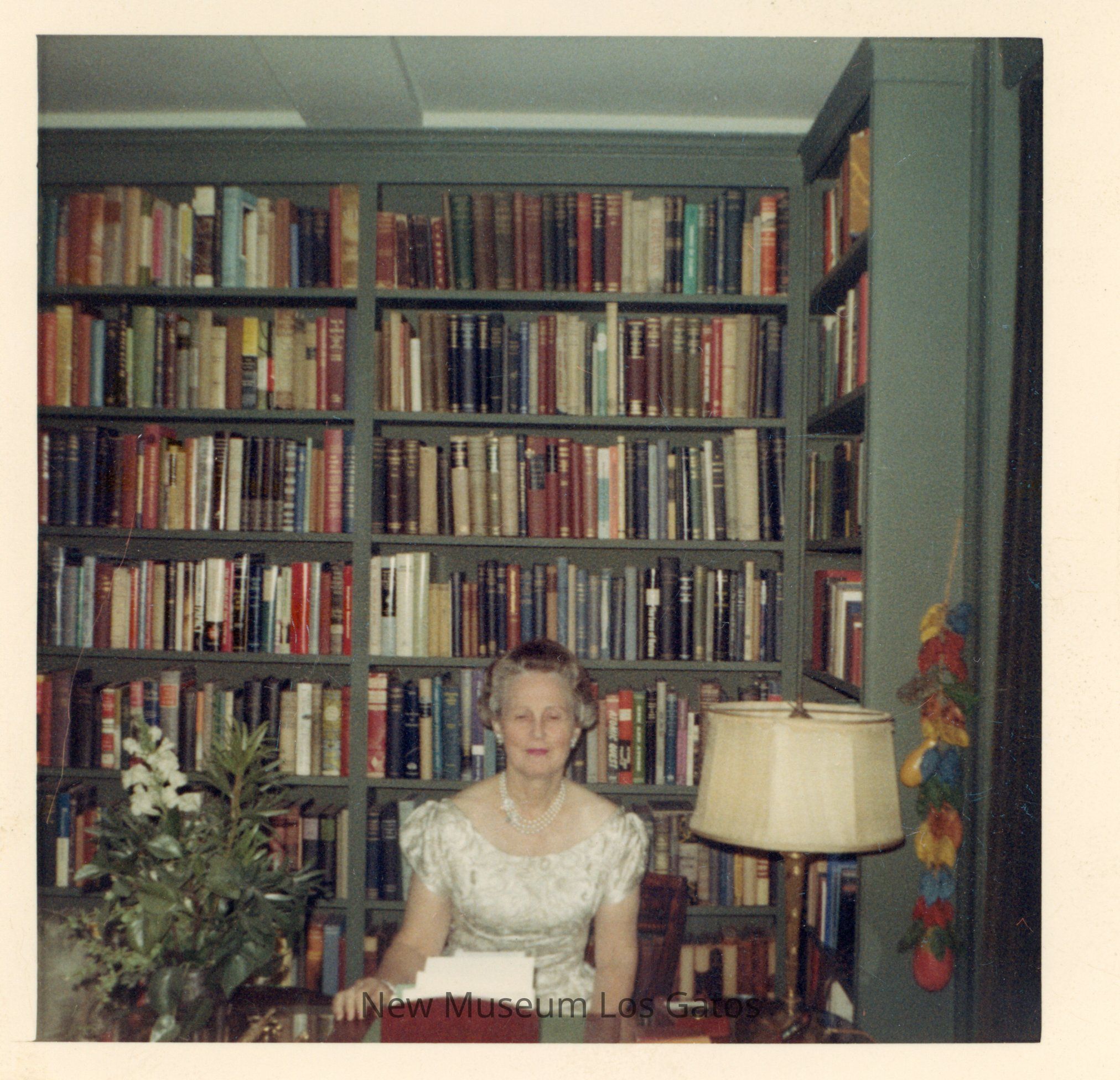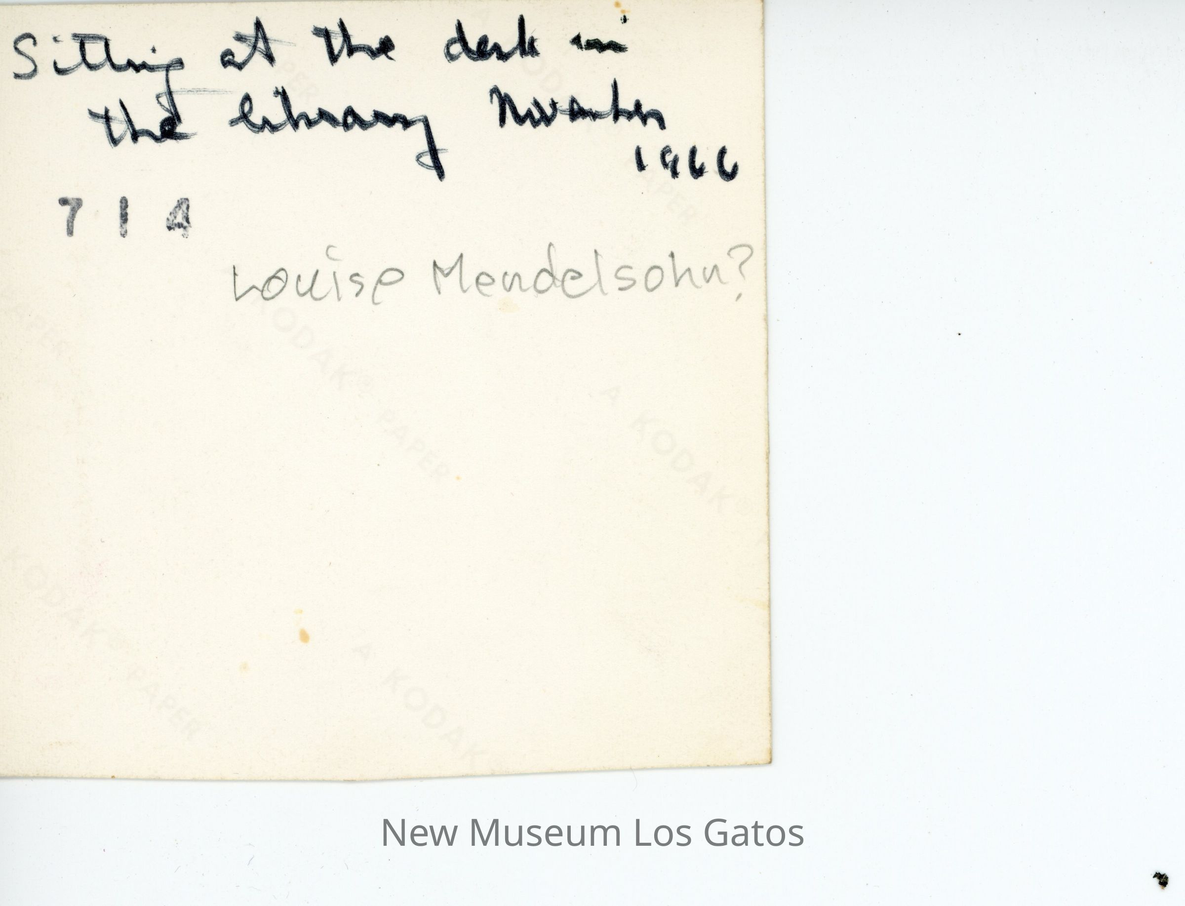A color photograph of a woman, possibly Louise Mendelsohn, sitting at a desk in the foreground with bookcases in the background.Collection