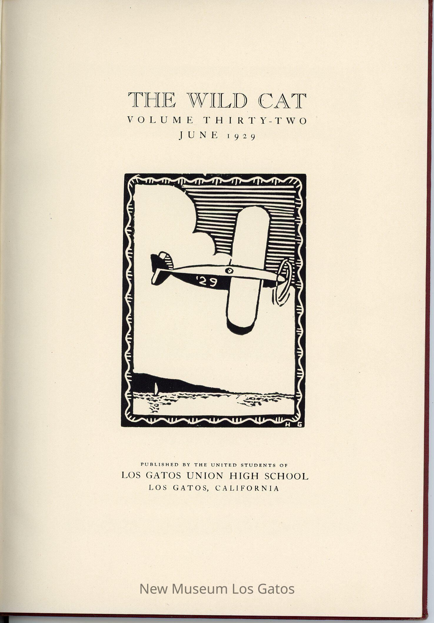 The Wildcat, a hardcover literary magazine/yearbook published by the students of Los Gatos High School in June 1929, volume number 32. Issue number is not specified in this particular issue.