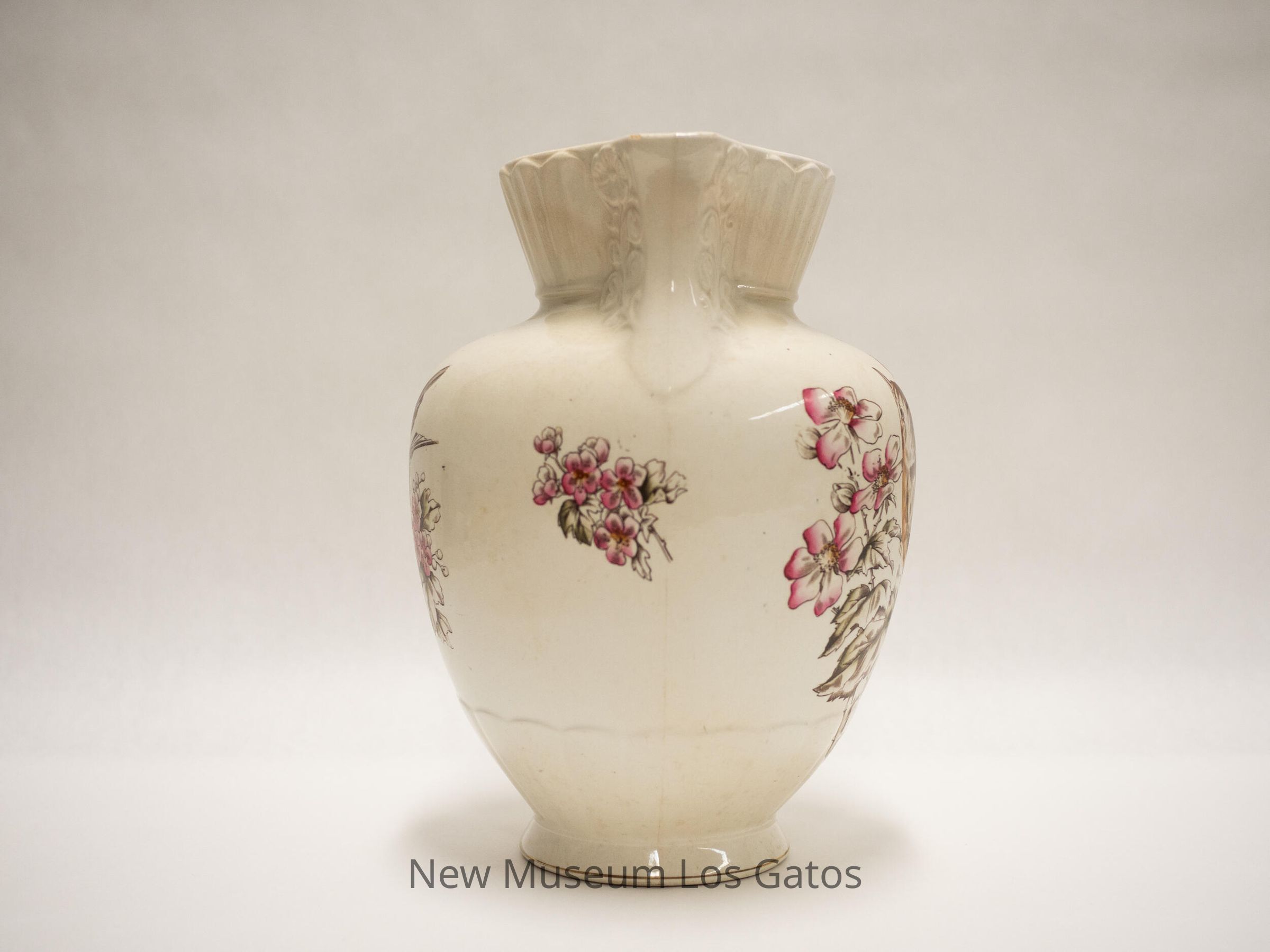 White ceramic water pitcher with a decorative bird, pink berries, and pink flowers on both sides. On one side, the bird is looking upwards, on the other side the bird is crouching and looking down. The bird looks like a robin, and the berries look like raspberries. There is also decorative patterning along the base, along the mouth/spout, and where the handle meets the mouth.Collection