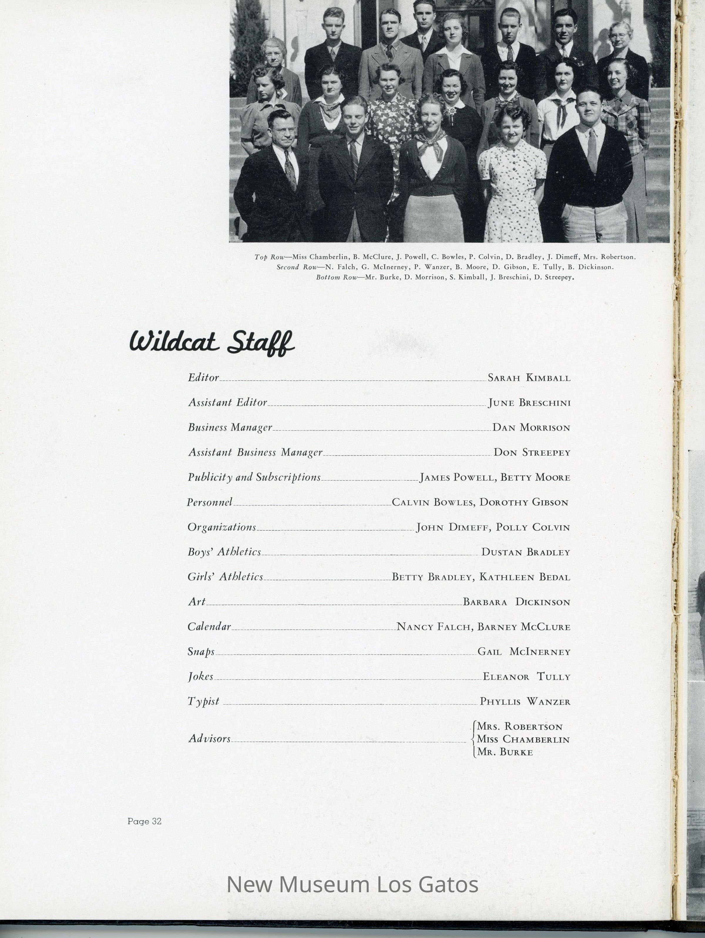 The Wildcat, a hardcover literary magazine/yearbook published by the students of Los Gatos High School in June 1938, volume number 41. Issue number is not specified in this particular issue. Inside the yearbook was a punch card for athletic game attendance.Collection