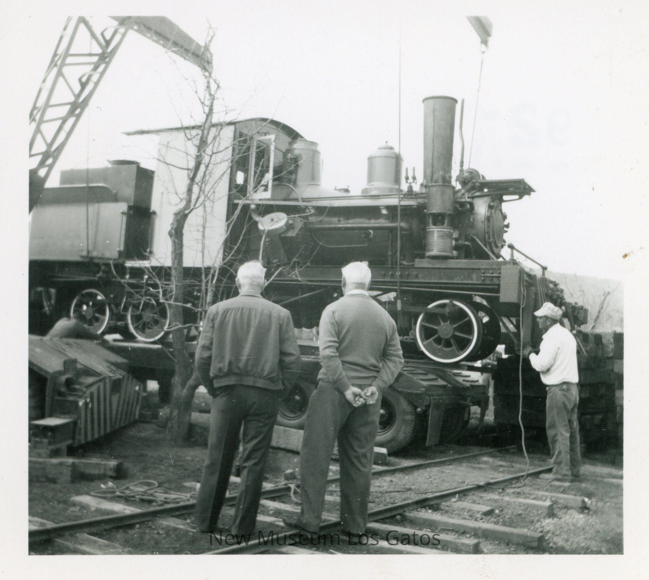 A black and white photograph featuring a steam engine on a truck. The truck and engine are parked near train tracks, and there are three men looking up at the engine; two in the center of the image, and one off to the right. The image is surrounded by a white border.Collection