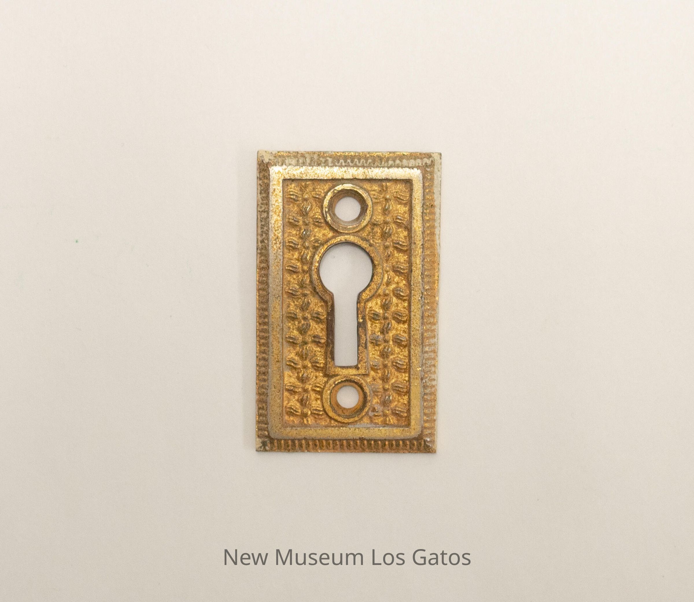 A small, rectangular golden escutcheon with a keyhole in the center and two circular holes, one on top and one underneath the keyhole. There is a raised edge along the border, with a floral pattern decorating the face of the escutcheon.Collection