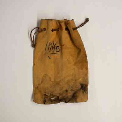 A brown canvas drawstring bag, with a brown woven string through metal grommets at the top. The bag is stamped with the bank's identifying information on one side.
