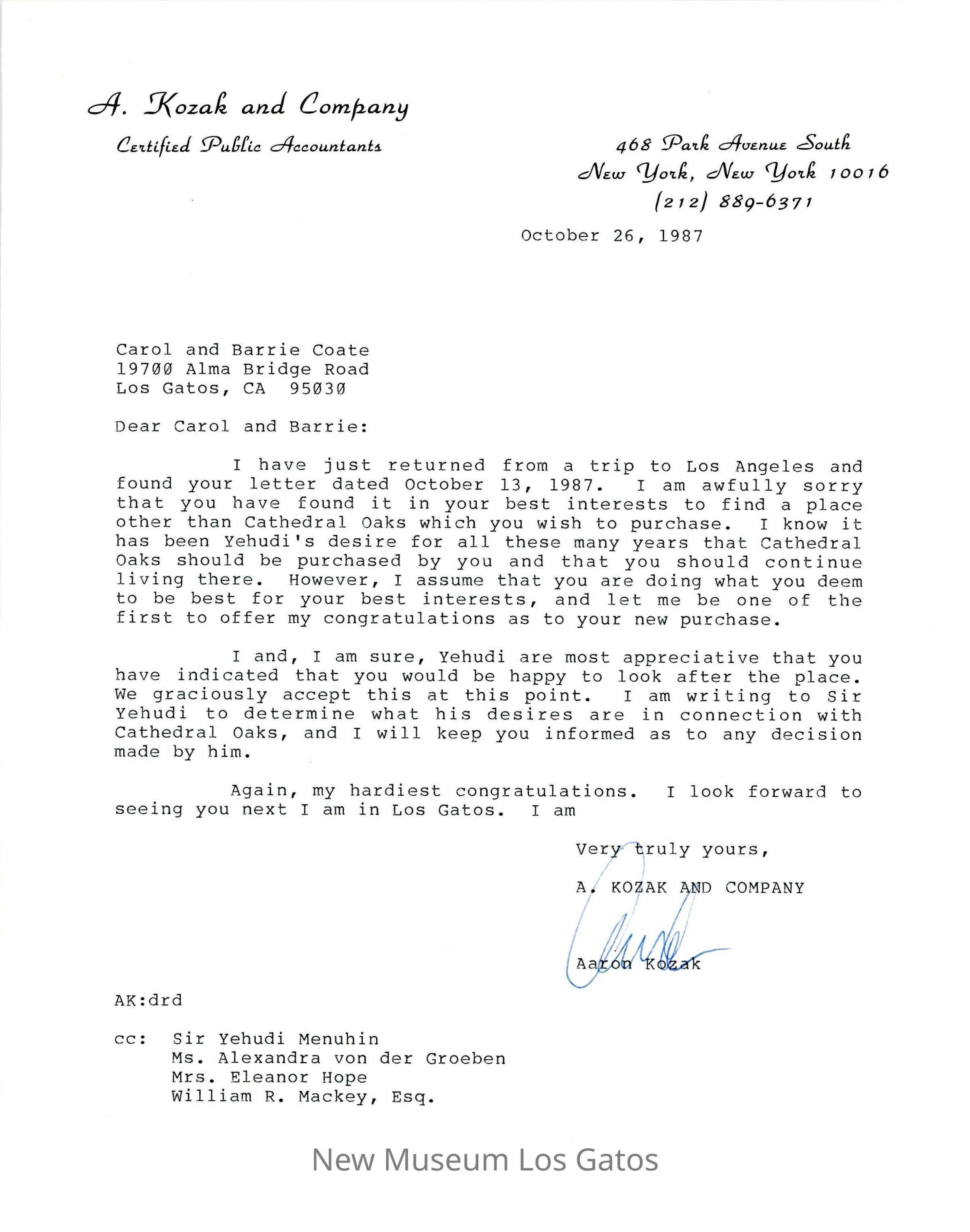 A single page letter, from Aaron Kozak to Barrie and Carol Coate. Also cc'ed is Yehudi Menuhin, Alexandra von der Groeben, William Mackey, and Eleanor Hope. The letter is dated October 26, 1986.Subject Place