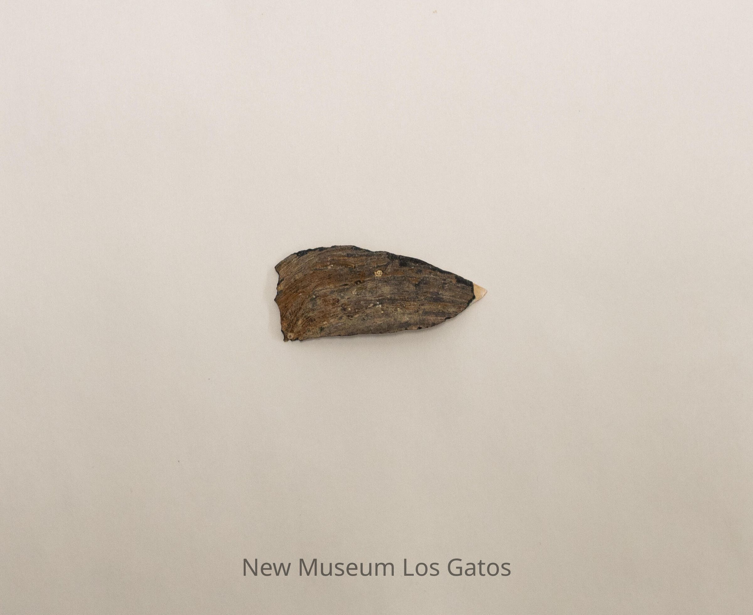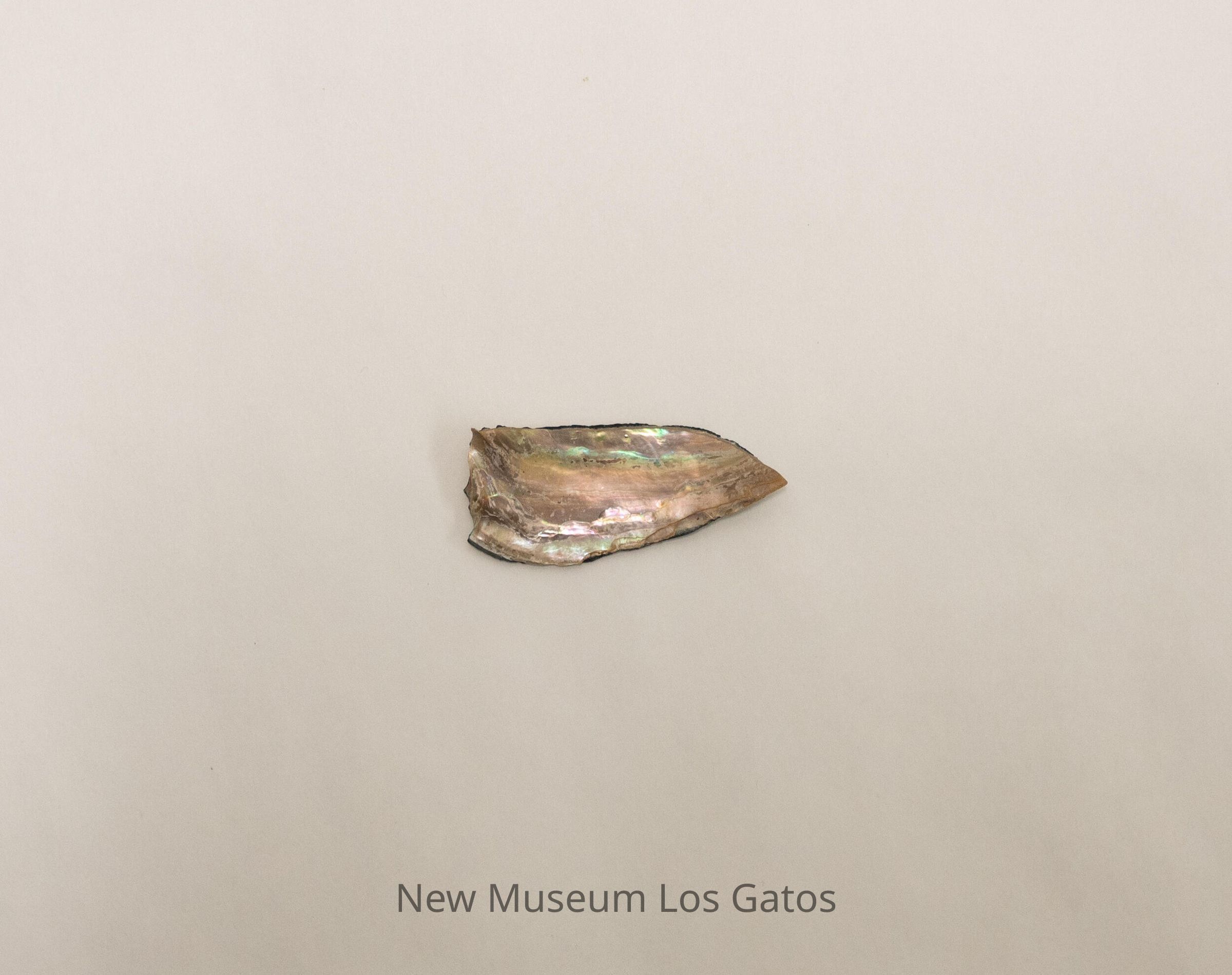 A small shard of an abalone shell. One side is light colored and iridescent, and the other side is matte gray.Collection