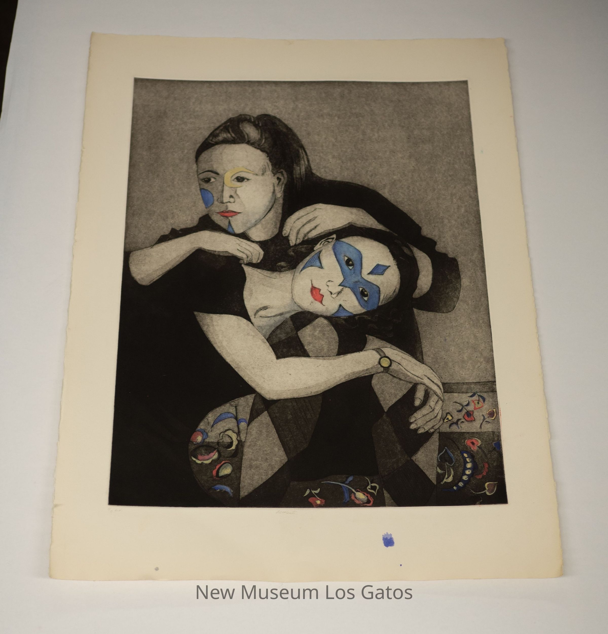 An etching and aquatint print with watercolor and ink accents. The print depicts two girls leaning on each other, wearing circus-like makeup on their faces.