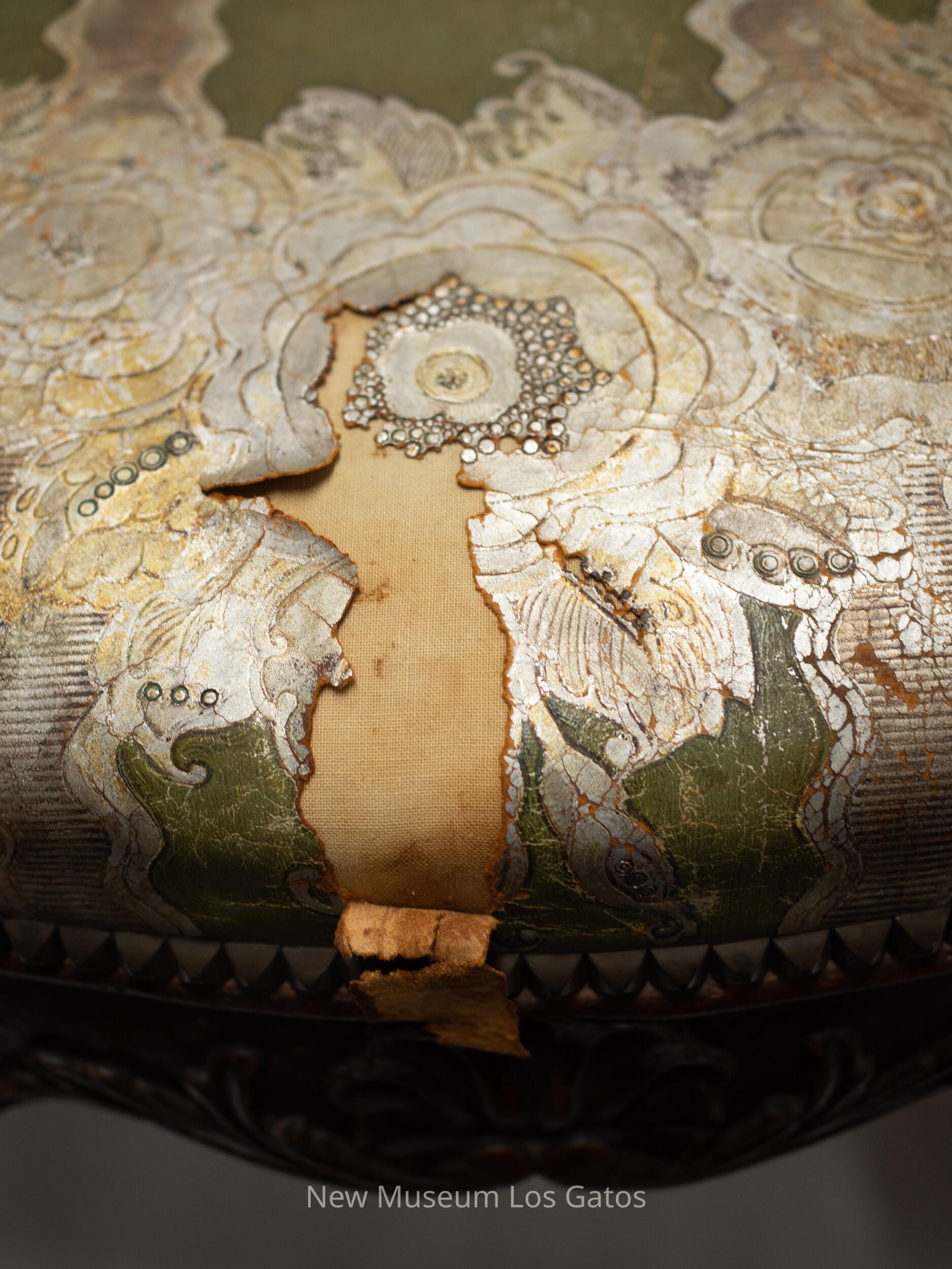 A wooden chair with green leather upholstery on the seat and the back. The upholstery is decorated with an embossed gold, silver, green, and red/brown floral pattern. The back of the chair is tan, and there are small square & pyramidal metal studs along the top edge of the back and the bottom edge of the seat, in between the wood and the leather.Collection