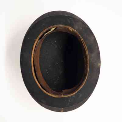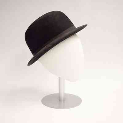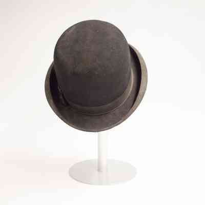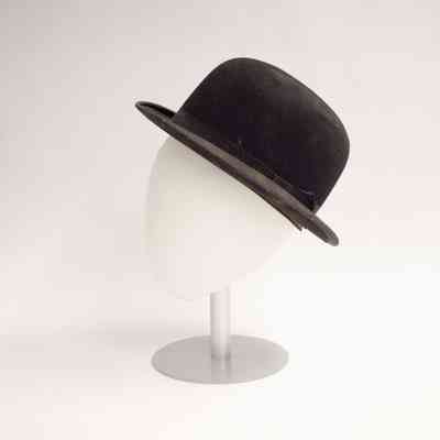 A plain, black felt bowler hat. The hat has a brim that turns up slightly on either side, as well as a black ribbon around the base of the crown.Collection