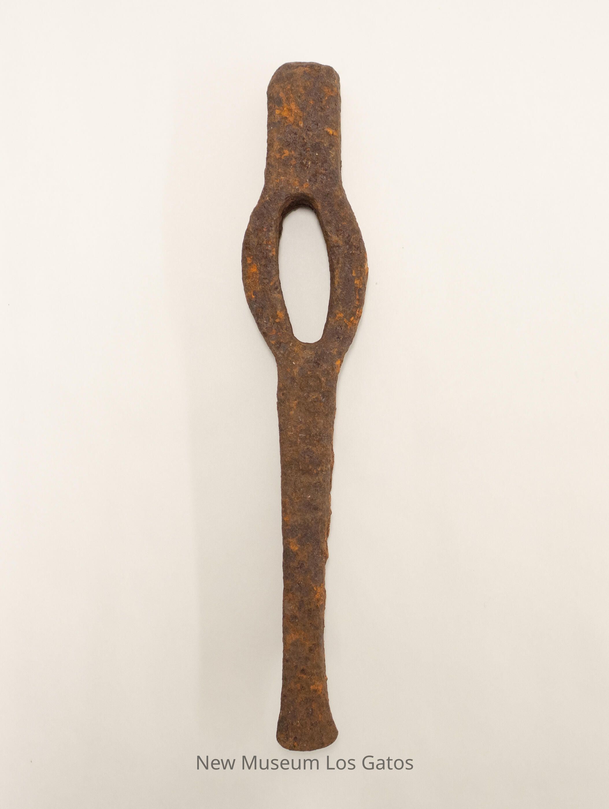 The metal portion of a pickaxe, with the wooden handle missing. From a top view, the head is rectangular at the top, bumps out into a circle in the middle with an oval hole for the handle, and narrows to a point at the bottom.Collection