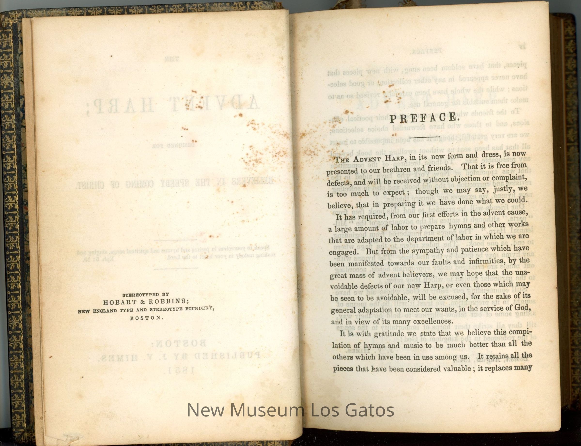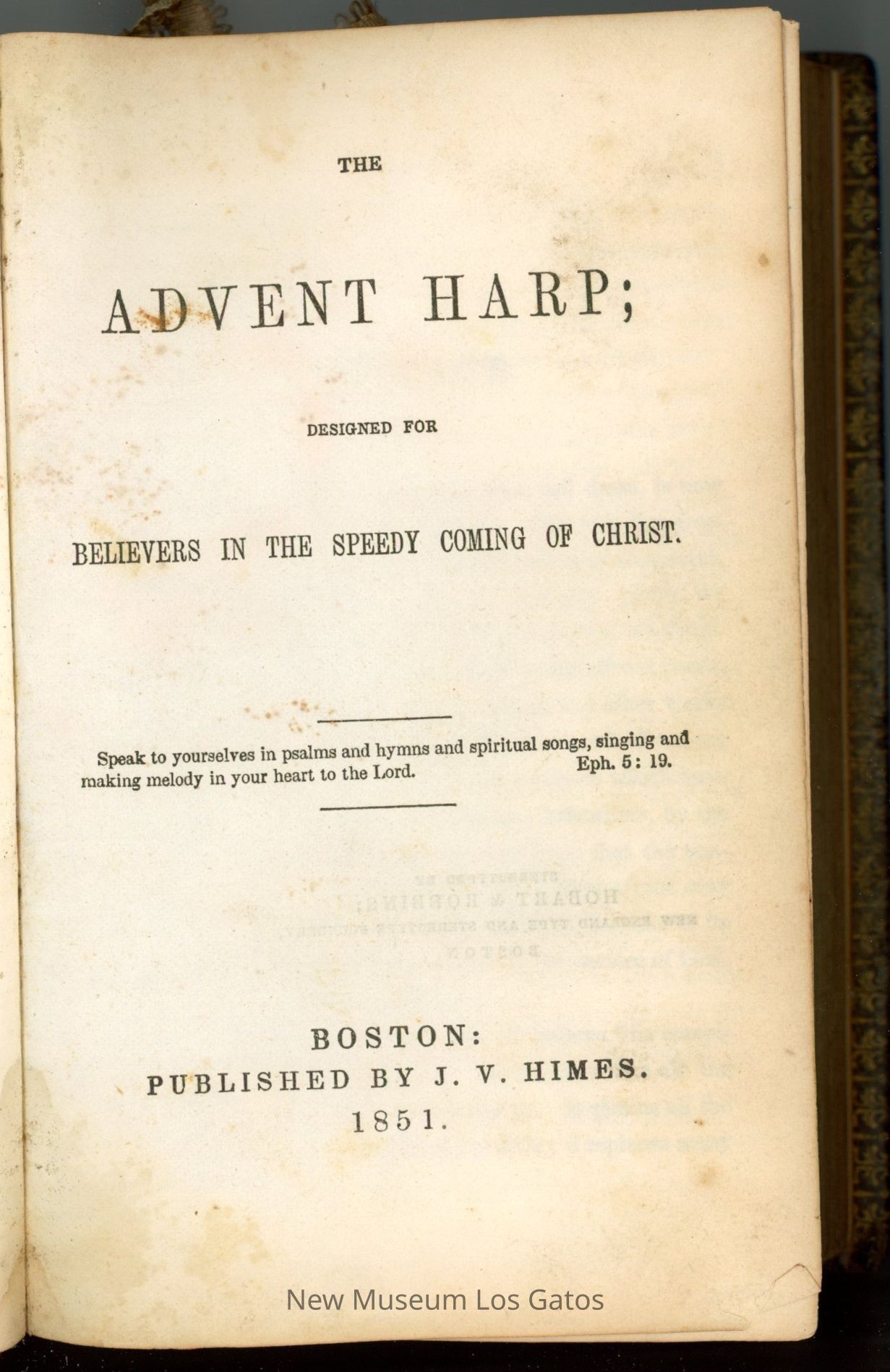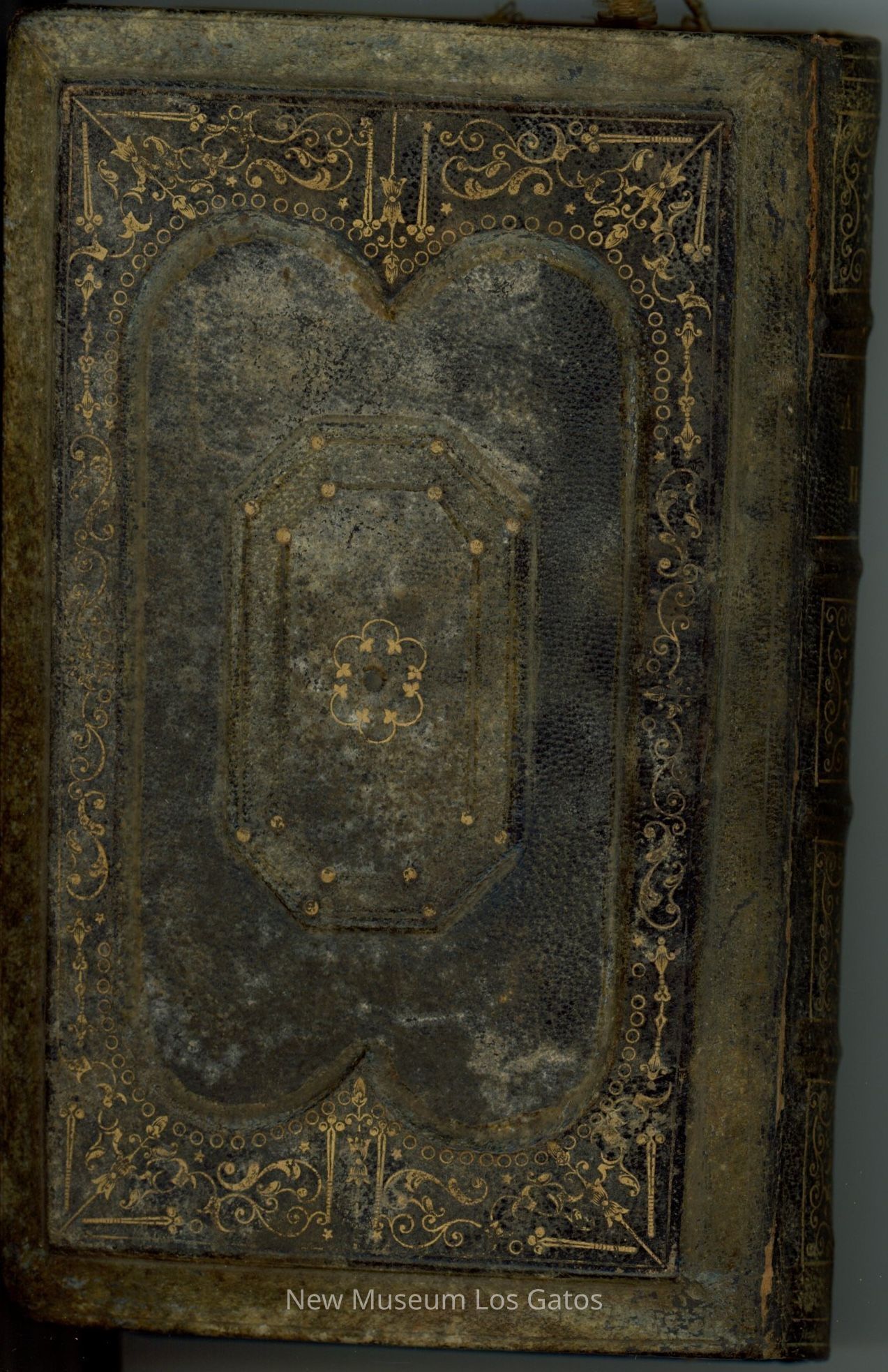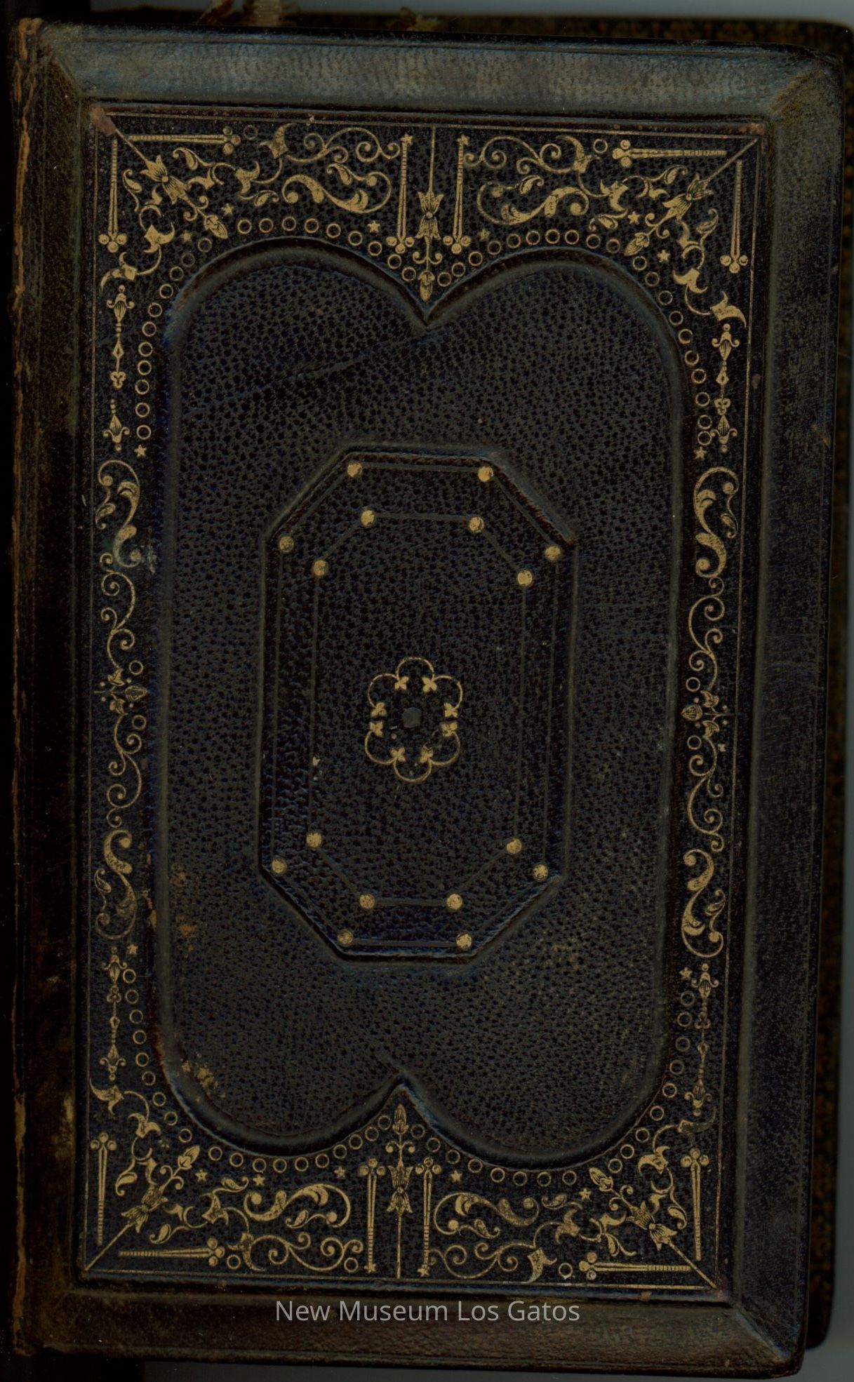A small, black leather-bound book, featuring a collection of psalms and hymns. There are gold decorative swirls throughout both covers and the spine. The edges of the pages are gilded, and also feature an inlaid decorative pattern.Collection