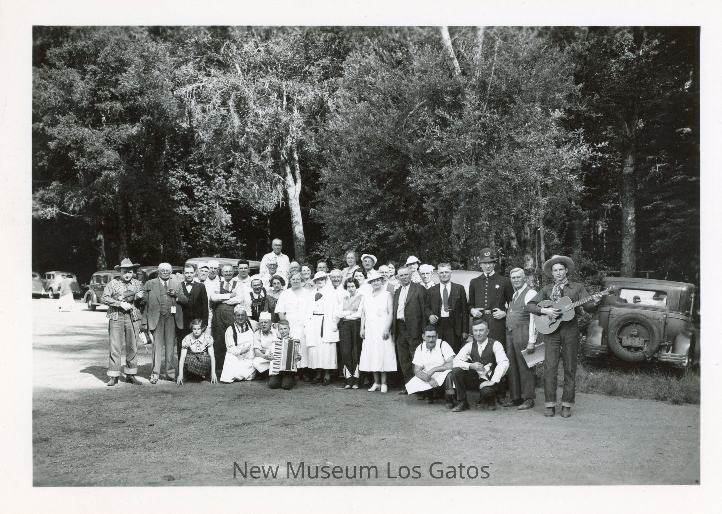 Two identical black and white photographs, featuring a large group of people. The group consists of men, women, and children, most of whom are standing, but some of whom are kneeling. There is a man wearing a broad-brimmed hat and carrying a guitar on the right side of the group, and a man wearing a broad-brimmed hat and carrying a violin on the left side of the group. There are numerous cars behind the group, and trees in the background.